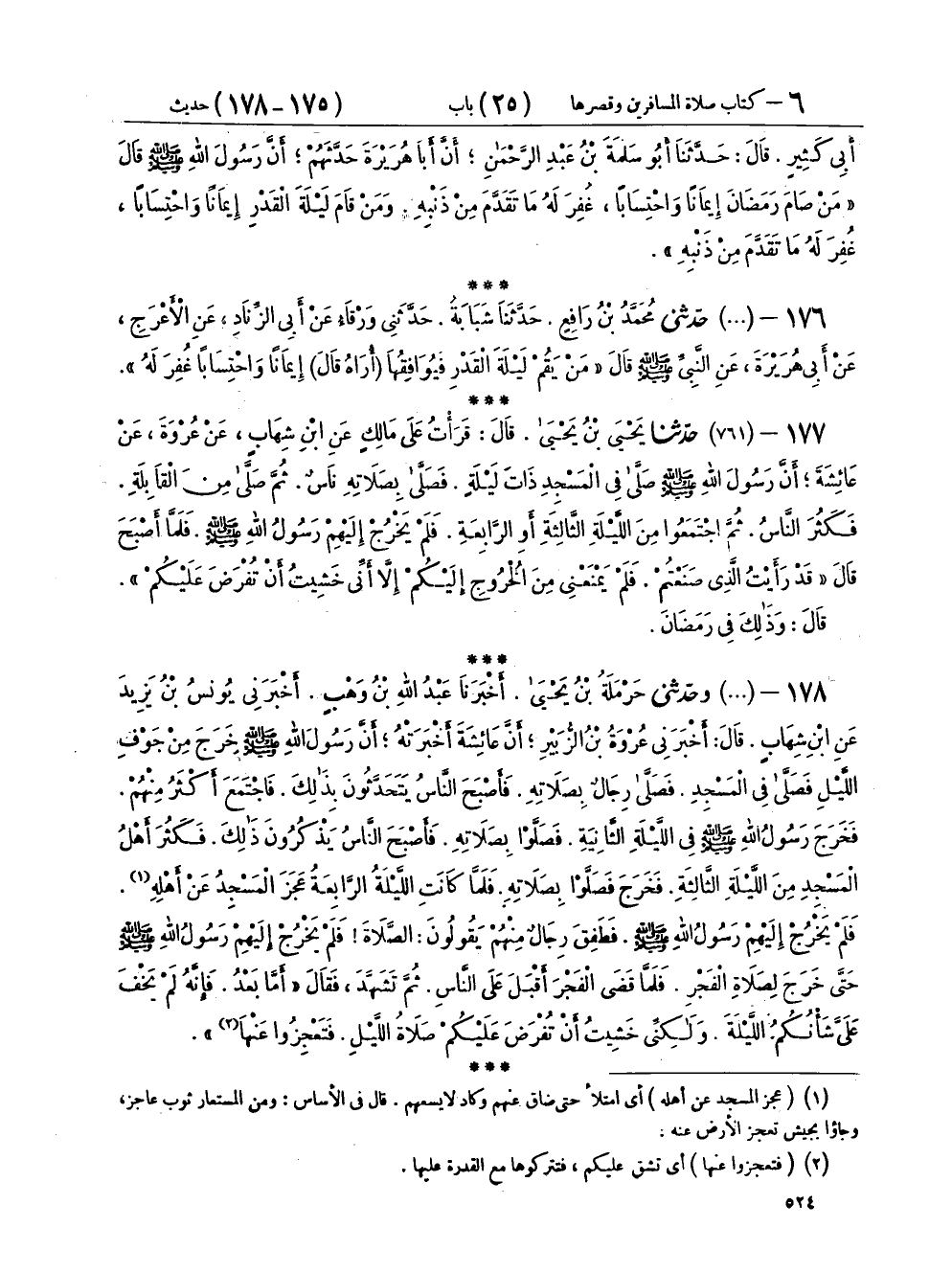 ١٧٧ - (٧٦١) حَدَّثَنَا يَحْيَى بْنُ يَحْيَى، قَالَ قَرَأْتُ عَلَى مَالِكٍ، عَنِ ابْنِ شِهَابٍ، عَنْ عُرْوَةَ، عَنْ عَائِشَةَ، أَنَّ رَسُولَ اللهِ صَلَّى اللهُ عَلَيْهِ وَسَلَّمَ صَلَّى فِي الْمَسْجِدِ ذَاتَ لَيْلَةٍ، فَصَلَّى بِصَلَاتِهِ نَاسٌ، ثُمَّ صَلَّى مِنَ الْقَابِلَةِ، فَكَثُرَ النَّاسُ، ثُمَّ اجْتَمَعُوا مِنَ اللَّيْلَةِ الثَّالِثَةِ، أَوِ الرَّابِعَةِ فَلَمْ يَخْرُجْ إِلَيْهِمْ رَسُولُ اللهِ صَلَّى اللهُ عَلَيْهِ وَسَلَّمَ، فَلَمَّا أَصْبَحَ، قَالَ: «قَدْ رَأَيْتُ الَّذِي صَنَعْتُمْ، فَلَمْ يَمْنَعْنِي مِنَ الْخُرُوجِ إِلَيْكُمْ إِلَّا أَنِّي خَشِيتُ أَنْ تُفْرَضَ عَلَيْكُمْ»، قَالَ: وَذَلِكَ فِي رَمَضَانَ
