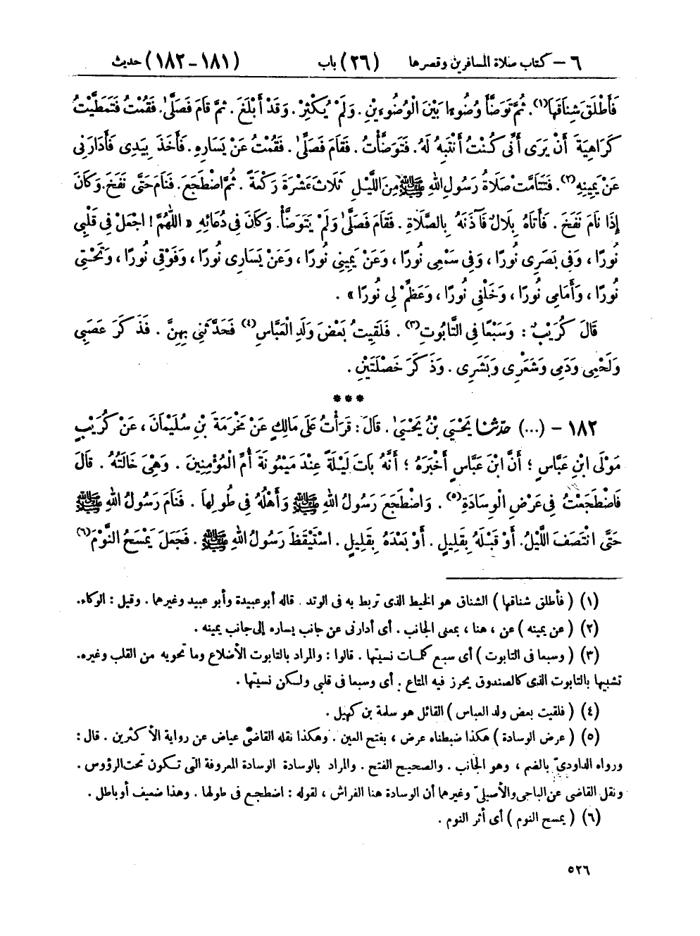 ١٨٢ - (٧٦٣) حَدَّثَنَا يَحْيَى بْنُ يَحْيَى، قَالَ: قَرَأْتُ عَلَى مَالِكٍ، عَنْ مَخْرَمَةَ بْنِ سُلَيْمَانَ، عَنْ كُرَيْبٍ، مَوْلَى ابْنِ عَبَّاسٍ، أَنَّ ابْنَ عَبَّاسٍ أَخْبَرَهُ، أَنَّهُ بَاتَ لَيْلَةً عِنْدَ مَيْمُونَةَ أُمِّ الْمُؤْمِنِينَ، وَهِيَ خَالَتُهُ، قَالَ: فَاضْطَجَعْتُ فِي عَرْضِ الْوِسَادَةِ، وَاضْطَجَعَ رَسُولُ اللهِ صَلَّى اللهُ عَلَيْهِ وَسَلَّمَ وَأَهْلُهُ فِي طُولِهَا، فَنَامَ رَسُولُ اللهِ صَلَّى اللهُ عَلَيْهِ وَسَلَّمَ حَتَّى انْتَصَفَ اللَّيْلُ، أَوْ قَبْلَهُ بِقَلِيلٍ، أَوْ بَعْدَهُ بِقَلِيلٍ، اسْتَيْقَظَ رَسُولُ اللهِ صَلَّى اللهُ عَلَيْهِ وَسَلَّمَ، فَجَعَلَ يَمْسَحُ النَّوْمَ عَنْ وَجْهِهِ بِيَدِهِ، ثُمَّ قَرَأَ الْعَشْرَ الْآيَاتِ الْخَوَاتِمَ مِنْ سُورَةِ آلِ عِمْرَانَ، ثُمَّ قَامَ إِلَى شَنٍّ مُعَلَّقَةٍ، فَتَوَضَّأَ مِنْهَا فَأَحْسَنَ وُضُوءَهُ، ثُمَّ قَامَ فَصَلَّى، قَالَ ابْنُ عَبَّاسٍ: فَقُمْتُ فَصَنَعْتُ مِثْلَ مَا صَنَعَ رَسُولُ اللهِ صَلَّى اللهُ عَلَيْهِ وَسَلَّمَ، ثُمَّ ذَهَبْتُ فَقُمْتُ إِلَى جَنْبِهِ، فَوَضَعَ رَسُولُ اللهِ صَلَّى اللهُ عَلَيْهِ وَسَلَّمَ يَدَهُ الْيُمْنَى عَلَى رَأْسِي، وَأَخَذَ بِأُذُنِي الْيُمْنَى يَفْتِلُهَا، فَصَلَّى رَكْعَتَيْنِ، ثُمَّ رَكْعَتَيْنِ، ثُمَّ رَكْعَتَيْنِ، ثُمَّ رَكْعَتَيْنِ، ثُمَّ رَكْعَتَيْنِ، ثُمَّ رَكْعَتَيْنِ، ثُمَّ أَوْتَرَ، ثُمَّ اضْطَجَعَ حَتَّى جَاءَ الْمُؤَذِّنُ، فَقَامَ فَصَلَّى رَكْعَتَيْنِ خَفِيفَتَيْنِ، ثُمَّ خَرَجَ فَصَلَّى الصُّبْحَ.
