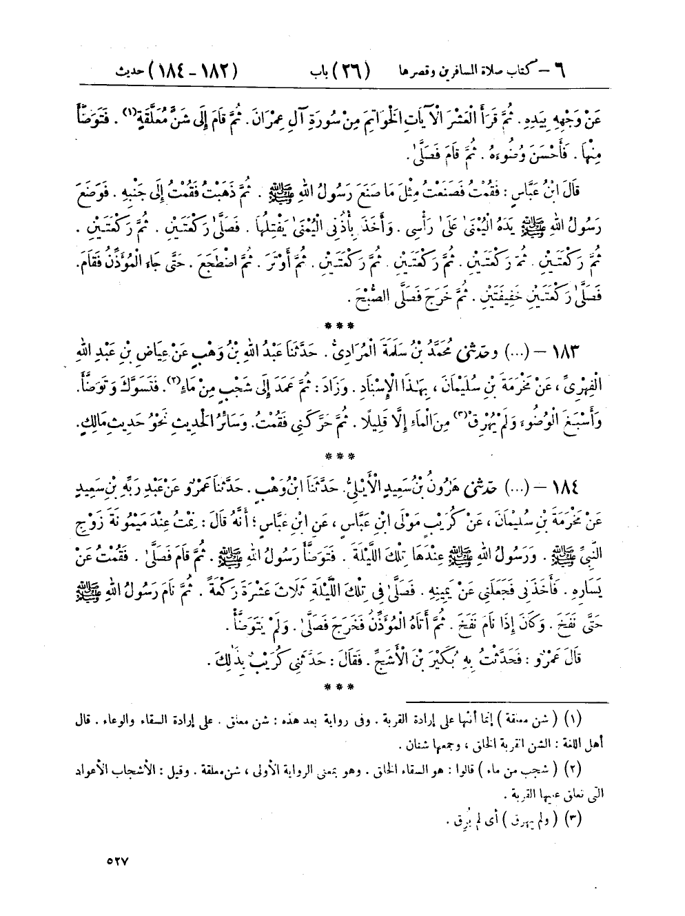 ١٨٤ - (٧٦٣) حَدَّثَنِي هَارُونُ بْنُ سَعِيدٍ الْأَيْلِيُّ، حَدَّثَنَا ابْنُ وَهْبٍ، حَدَّثَنَا عَمْرٌو، عَنْ عَبْدِ رَبِّهِ بْنِ سَعِيدٍ، عَنْ مَخْرَمَةَ بْنِ سُلَيْمَانَ، عَنْ كُرَيْبٍ، مَوْلَى ابْنِ عَبَّاسٍ، عَنِ ابْنِ عَبَّاسٍ، أَنَّهُ قَالَ: نِمْتُ عِنْدَ مَيْمُونَةَ، زَوْجِ النَّبِيِّ صَلَّى اللهُ عَلَيْهِ وَسَلَّمَ، وَرَسُولُ اللهِ صَلَّى اللهُ عَلَيْهِ وَسَلَّمَ عِنْدَهَا تِلْكَ اللَّيْلَةَ، «فَتَوَضَّأَ رَسُولُ اللهِ صَلَّى اللهُ عَلَيْهِ وَسَلَّمَ، ثُمَّ قَامَ فَصَلَّى، فَقُمْتُ عَنْ يَسَارِهِ، فَأَخَذَنِي فَجَعَلَنِي عَنْ يَمِينِهِ، فَصَلَّى فِي تِلْكَ اللَّيْلَةِ ثَلَاثَ عَشْرَةَ رَكْعَةً، ثُمَّ نَامَ رَسُولُ اللهِ صَلَّى اللهُ عَلَيْهِ وَسَلَّمَ حَتَّى نَفَخَ، وَكَانَ إِذَا نَامَ نَفَخَ، ثُمَّ أَتَاهُ الْمُؤَذِّنُ فَخَرَجَ فَصَلَّى، وَلَمْ يَتَوَضَّأْ». قَالَ عَمْرٌو: فَحَدَّثْتُ بِهِ بُكَيْرَ بْنَ الْأَشَجِّ، فَقَالَ: حَدَّثَنِي كُرَيْبٌ بِذَلِكَ