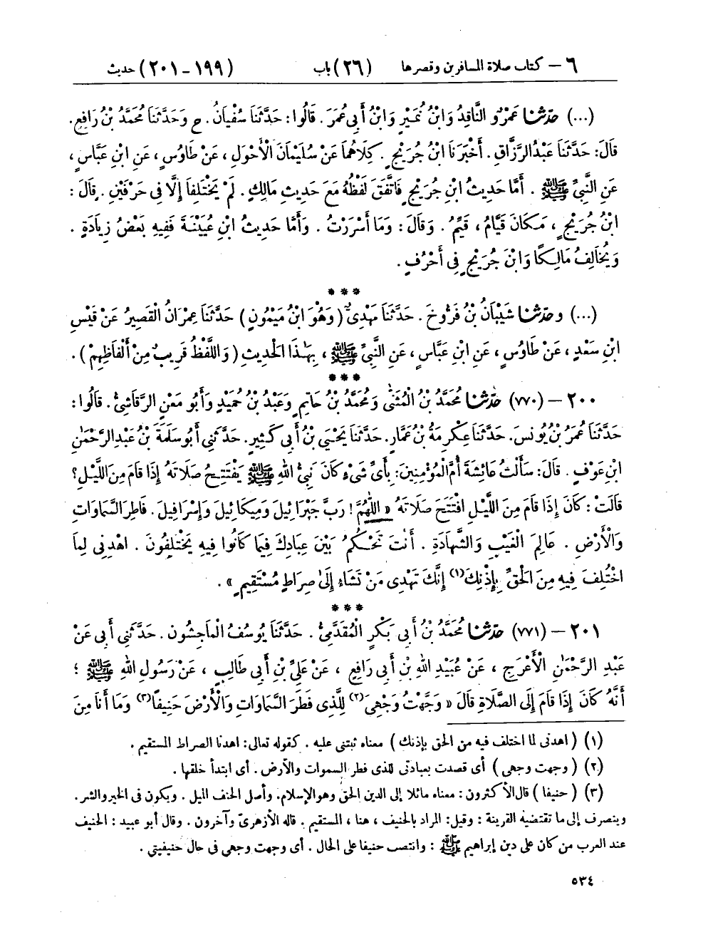 ٢٠٠ - (٧٧٠) حَدَّثَنَا مُحَمَّدُ بْنُ الْمُثَنَّى، وَمُحَمَّدُ بْنُ حَاتِمٍ، وَعَبْدُ بْنُ حُمَيْدٍ، وَأَبُو مَعْنٍ الرَّقَاشِيُّ، قَالُوا: حَدَّثَنَا عُمَرُ بْنُ يُونُسَ، حَدَّثَنَا عِكْرِمَةُ بْنُ عَمَّارٍ، حَدَّثَنَا يَحْيَى بْنُ أَبِي كَثِيرٍ، حَدَّثَنِي أَبُو سَلَمَةَ بْنُ عَبْدِ الرَّحْمَنِ بْنِ عَوْفٍ، قَالَ: سَأَلْتُ عَائِشَةَ أُمَّ الْمُؤْمِنِينَ، بِأَيِّ شَيْءٍ كَانَ نَبِيُّ اللهِ صَلَّى اللهُ عَلَيْهِ وَسَلَّمَ يَفْتَتِحُ صَلَاتَهُ إِذَا قَامَ مِنَ اللَّيْلِ؟ قَالَتْ: كَانَ إِذَا قَامَ مِنَ اللَّيْلِ افْتَتَحَ صَلَاتَهُ: «اللهُمَّ رَبَّ جَبْرَائِيلَ، وَمِيكَائِيلَ، وَإِسْرَافِيلَ، فَاطِرَ السَّمَاوَاتِ وَالْأَرْضِ، عَالِمَ الْغَيْبِ وَالشَّهَادَةِ، أَنْتَ تَحْكُمُ بَيْنَ عِبَادِكَ فِيمَا كَانُوا فِيهِ يَخْتَلِفُونَ، اهْدِنِي لِمَا اخْتُلِفَ فِيهِ مِنَ الْحَقِّ بِإِذْنِكَ، إِنَّكَ تَهْدِي مَنْ تَشَاءُ إِلَى صِرَاطٍ مُسْتَقِيمٍ»