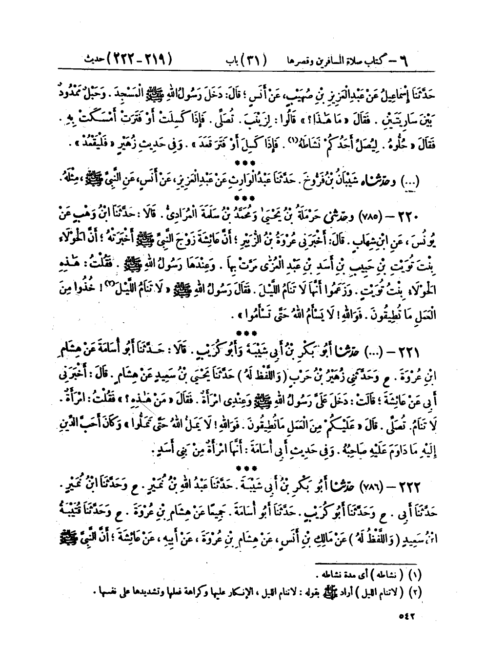 ٢٢٢ - (٧٨٦) حَدَّثَنَا أَبُو بَكْرِ بْنُ أَبِي شَيْبَةَ، حَدَّثَنَا عَبْدُ اللهِ بْنُ نُمَيْرٍ، ح وحَدَّثَنَا ابْنُ نُمَيْرٍ، حَدَّثَنَا أَبِي، ح وحَدَّثَنَا أَبُو كُرَيْبٍ، حَدَّثَنَا أَبُو أُسَامَةَ، جَمِيعًا عَنْ هِشَامِ بْنِ عُرْوَةَ، ح وحَدَّثَنَا قُتَيْبَةُ بْنُ سَعِيدٍ، وَاللَّفْظُ لَهُ، عَنْ مَالِكِ بْنِ أَنَسٍ، عَنْ هِشَامِ بْنِ عُرْوَةَ، عَنْ أَبِيهِ، عَنْ عَائِشَةَ، أَنَّ النَّبِيَّ صَلَّى اللهُ عَلَيْهِ وَسَلَّمَ، قَالَ: «إِذَا نَعَسَ أَحَدُكُمْ فِي الصَّلَاةِ فَلْيَرْقُدْ حَتَّى يَذْهَبَ عَنْهُ النَّوْمُ، فَإِنَّ أَحَدَكُمْ إِذَا صَلَّى وَهُوَ نَاعِسٌ لَعَلَّهُ يَذْهَبُ يَسْتَغْفِرُ، فَيَسُبُّ نَفْسَهُ»
