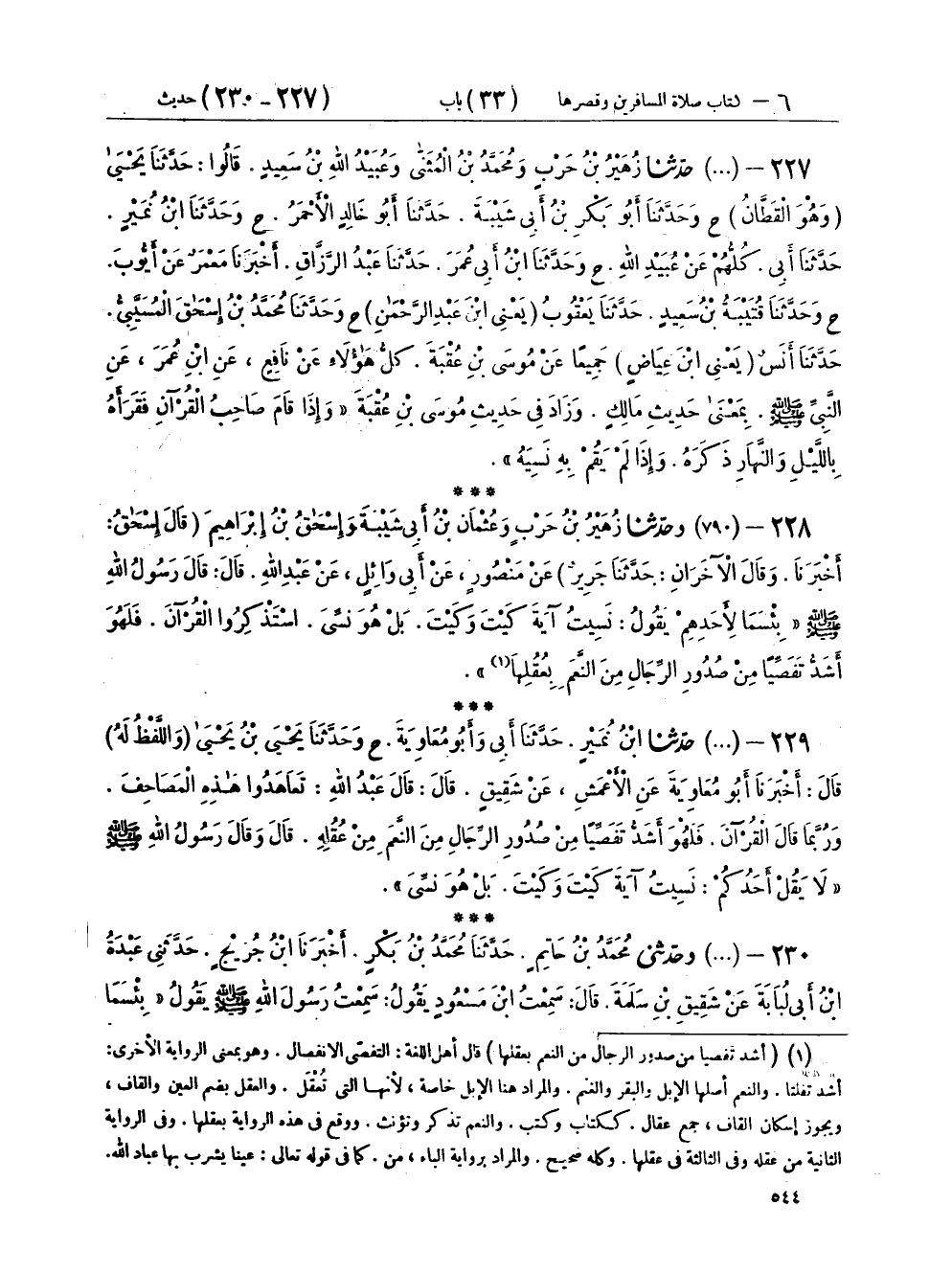 ٢٢٩ - (٧٩٠) حَدَّثَنَا ابْنُ نُمَيْرٍ، حَدَّثَنَا أَبِي، وَأَبُو مُعَاوِيَةَ، ح وحَدَّثَنَا يَحْيَى بْنُ يَحْيَى، وَاللَّفْظُ لَهُ، قَالَ: أَخْبَرَنَا أَبُو مُعَاوِيَةَ، عَنِ الْأَعْمَشِ، عَنْ شَقِيقٍ، قَالَ: قَالَ عَبْدُ اللهِ: " تَعَاهَدُوا هَذِهِ الْمَصَاحِفَ - وَرُبَّمَا قَالَ: الْقُرْآنَ - فَلَهُوَ أَشَدُّ تَفَصِّيًا مِنْ صُدُورِ الرِّجَالِ مِنَ النَّعَمِ مِنْ عُقُلِهِ "