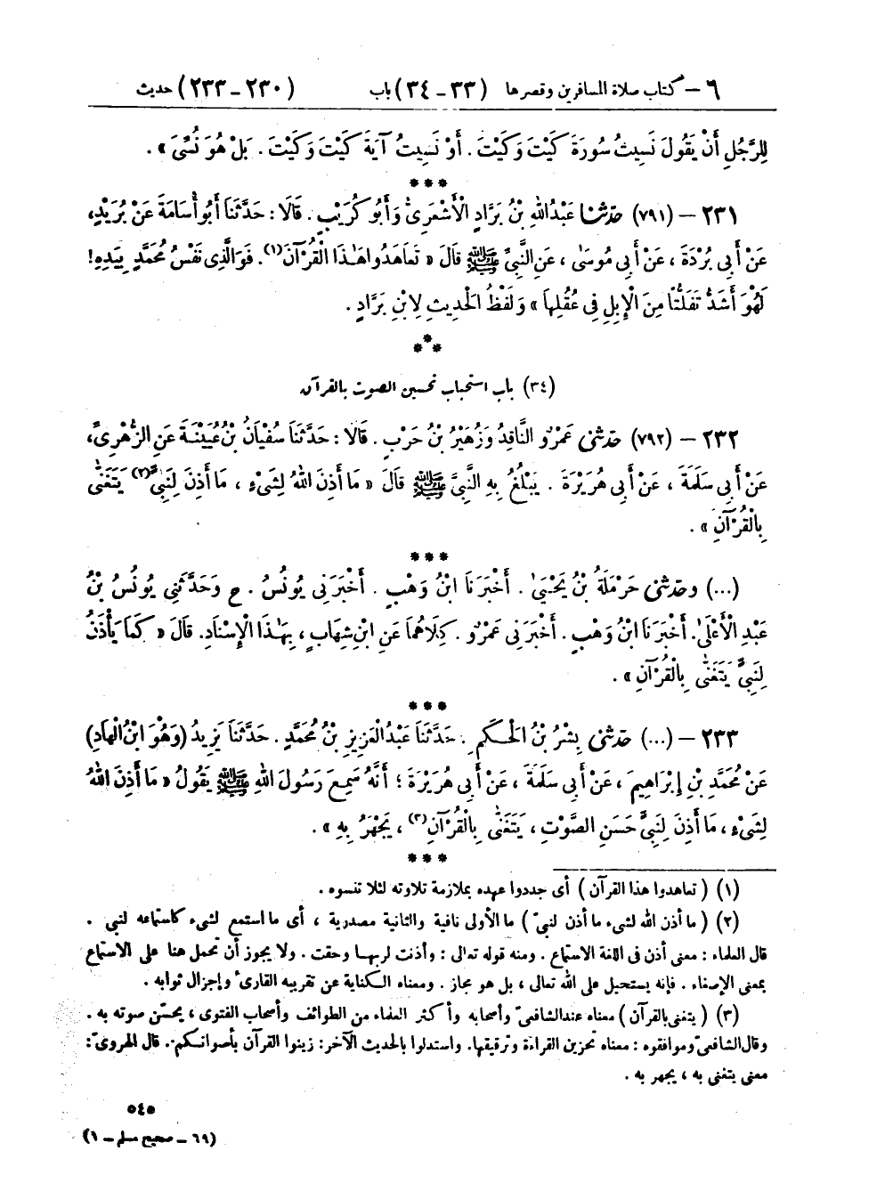 ٢٣٢ - (٧٩٢) حَدَّثَنِي عَمْرٌو النَّاقِدُ، وَزُهَيْرُ بْنُ حَرْبٍ، قَالَا: حَدَّثَنَا سُفْيَانُ بْنُ عُيَيْنَةَ، عَنِ الزُّهْرِيِّ، عَنْ أَبِي سَلَمَةَ، عَنْ أَبِي هُرَيْرَةَ، يَبْلُغُ بِهِ النَّبِيَّ صَلَّى اللهُ عَلَيْهِ وَسَلَّمَ، قَالَ: «مَا أَذِنَ اللهُ لِشَيْءٍ مَا أَذِنَ لِنَبِيٍّ يَتَغَنَّى بِالْقُرْآنِ».