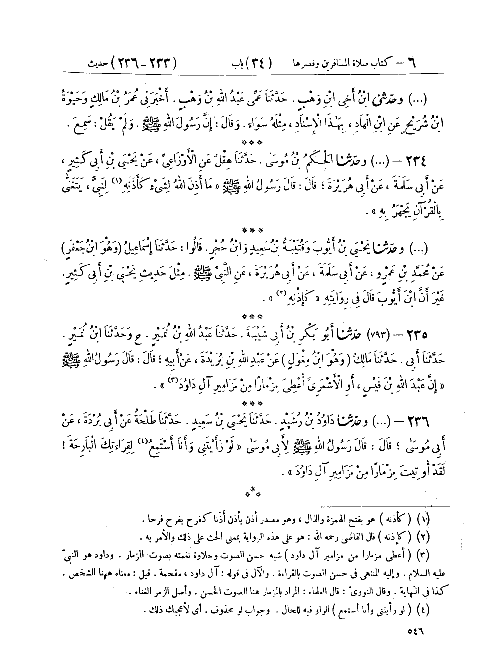 ٢٣٦ - (٧٩٣) وحَدَّثَنَا دَاوُدُ بْنُ رُشَيْدٍ، حَدَّثَنَا يَحْيَى بْنُ سَعِيدٍ، حَدَّثَنَا طَلْحَةُ، عَنْ أَبِي بُرْدَةَ، عَنْ أَبِي مُوسَى، قَالَ: قَالَ رَسُولُ اللهِ صَلَّى اللهُ عَلَيْهِ وَسَلَّمَ لِأَبِي مُوسَى: «لَوْ رَأَيْتَنِي وَأَنَا أَسْتَمِعُ لِقِرَاءَتِكَ الْبَارِحَةَ، لَقَدْ أُوتِيتَ مِزْمَارًا مِنْ مَزَامِيرِ آلِ دَاوُدَ»