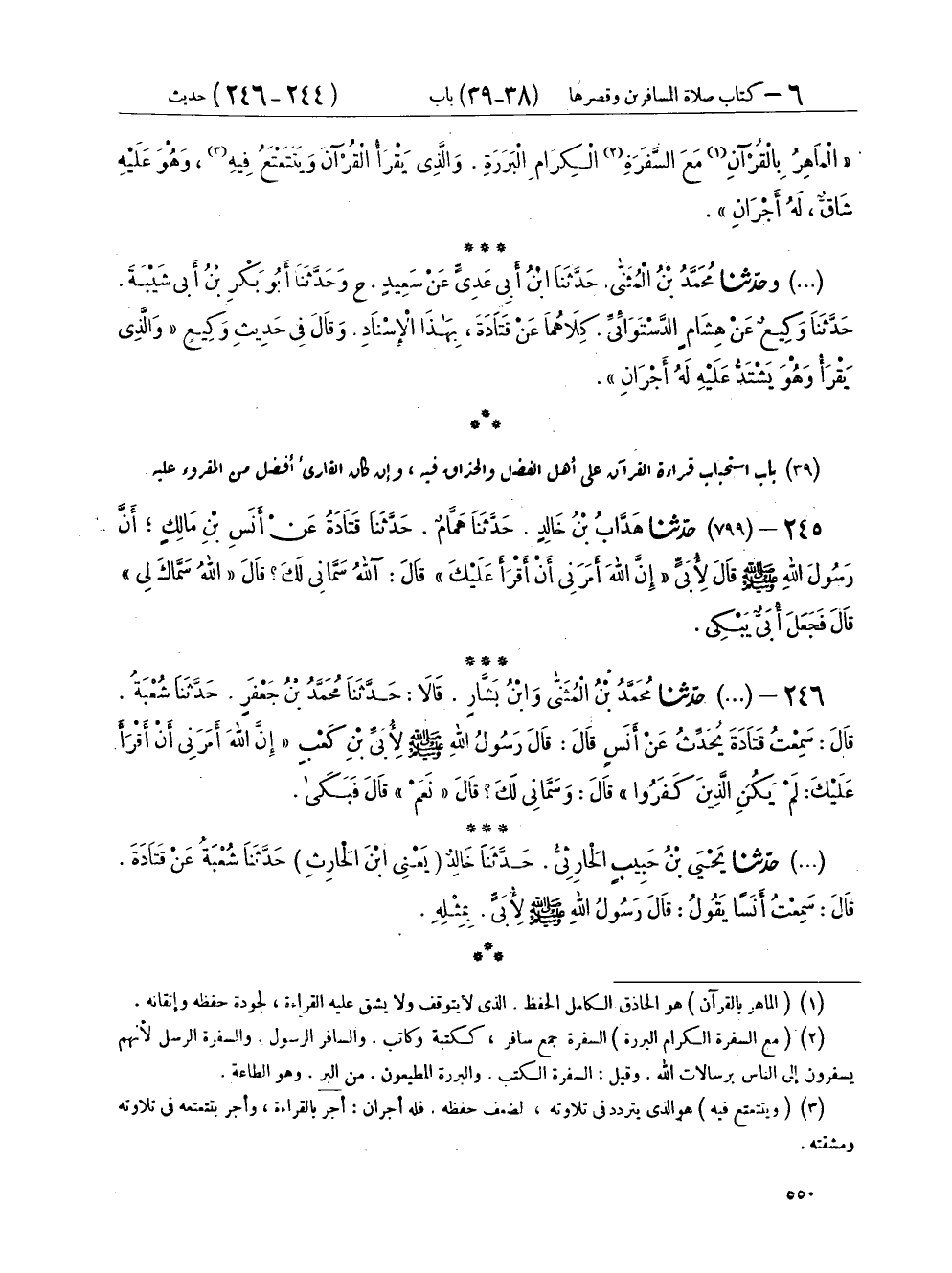 (٧٩٨) وحَدَّثَنَا مُحَمَّدُ بْنُ الْمُثَنَّى، حَدَّثَنَا ابْنُ أَبِي عَدِيٍّ، عَنْ سَعِيدٍ، ح وحَدَّثَنَا أَبُو بَكْرِ بْنُ أَبِي شَيْبَةَ، حَدَّثَنَا وَكِيعٌ، عَنْ هِشَامٍ الدَّسْتَوَائِيِّ، كِلَاهُمَا عَنْ قَتَادَةَ بِهَذَا الْإِسْنَادِ، وقَالَ فِي حَدِيثِ وَكِيعٍ: «وَالَّذِي يَقْرَأُ وَهُوَ يَشْتَدُّ عَلَيْهِ لَهُ أَجْرَانِ»