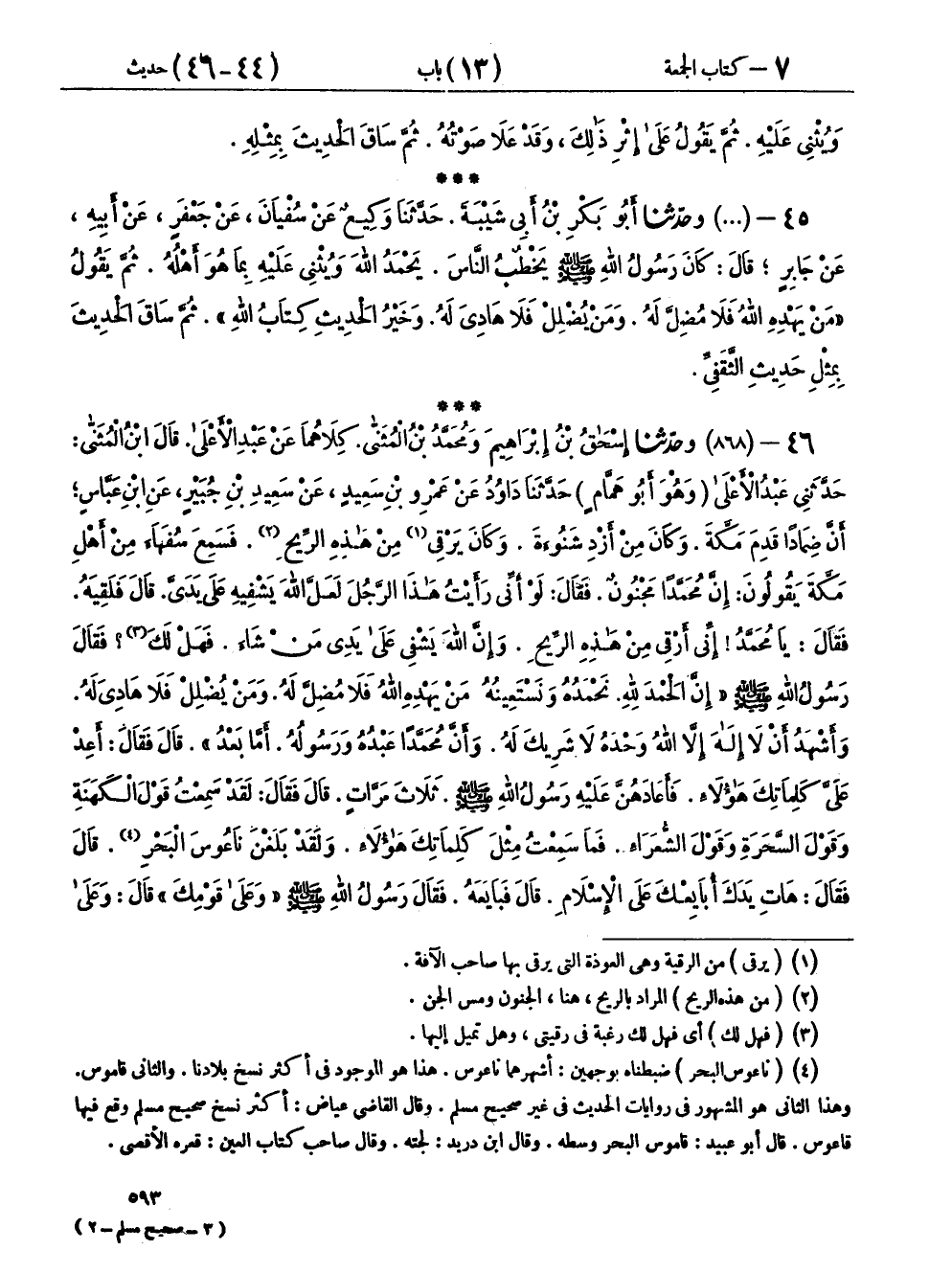 [ ش (يرقي) من الرقية وهي العوذة التي يرقى بها صاحب الآفة (من هذه الريح) المراد بالريح هنا الجنون ومس الجن (فهل لك) أي فهل لك رغبة في رقيتي وهل تميل إليها (ناعوس البحر) ضبطناه بوجهين أشهرهما ناعوس هذا هو الموجود في أكثر نسخ بلادنا والثاني القاموس وهذا الثاني هو المشهور في روايات الحديث في غير صحيح مسلم وقال القاضي عياض أكثر نسخ صحيح مسلم وقع فيها قاعوس قال أبو عبيد قاموس البحر وسطه وقال ابن دريد لجته وقال صاحب كتاب العين قعره الأقصى]