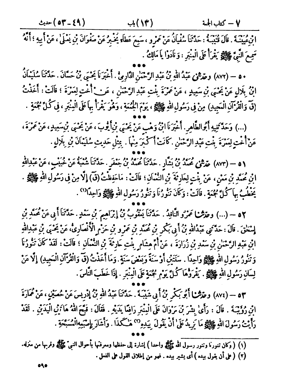 ٥٢ - (٨٧٣) وحَدَّثَنَا عَمْرٌو النَّاقِدُ، حَدَّثَنَا يَعْقُوبُ بْنُ إِبْرَاهِيمَ بْنِ سَعْدٍ، حَدَّثَنَا أَبِي، عَنْ مُحَمَّدِ بْنِ إِسْحَاقَ، قَالَ: حَدَّثَنِي عَبْدُ اللهِ بْنُ أَبِي بَكْرِ بْنِ مُحَمَّدِ بْنِ عَمْرِو بْنِ حَزْمٍ الْأَنْصَارِيُّ، عَنْ يَحْيَى بْنِ عَبْدِ اللهِ بْنِ عَبْدِ الرَّحْمَنِ بْنِ سَعْدِ بْنِ زُرَارَةَ، عَنْ أُمِّ هِشَامٍ بِنْتِ حَارِثَةَ بْنِ النُّعْمَانِ، قَالَتْ: «لَقَدْ كَانَ تَنُّورُنَا وَتَنُّورُ رَسُولِ اللهِ صَلَّى اللهُ عَلَيْهِ وَسَلَّمَ وَاحِدًا، سَنَتَيْنِ أَوْ سَنَةً وَبَعْضَ سَنَةٍ، وَمَا أَخَذْتُ ق وَالْقُرْآنِ الْمَجِيدِ إِلَّا عَنْ لِسَانِ رَسُولِ اللهِ صَلَّى اللهُ عَلَيْهِ وَسَلَّمَ، يَقْرَؤُهَا كُلَّ يَوْمِ جُمُعَةٍ عَلَى الْمِنْبَرِ، إِذَا خَطَبَ النَّاسَ»