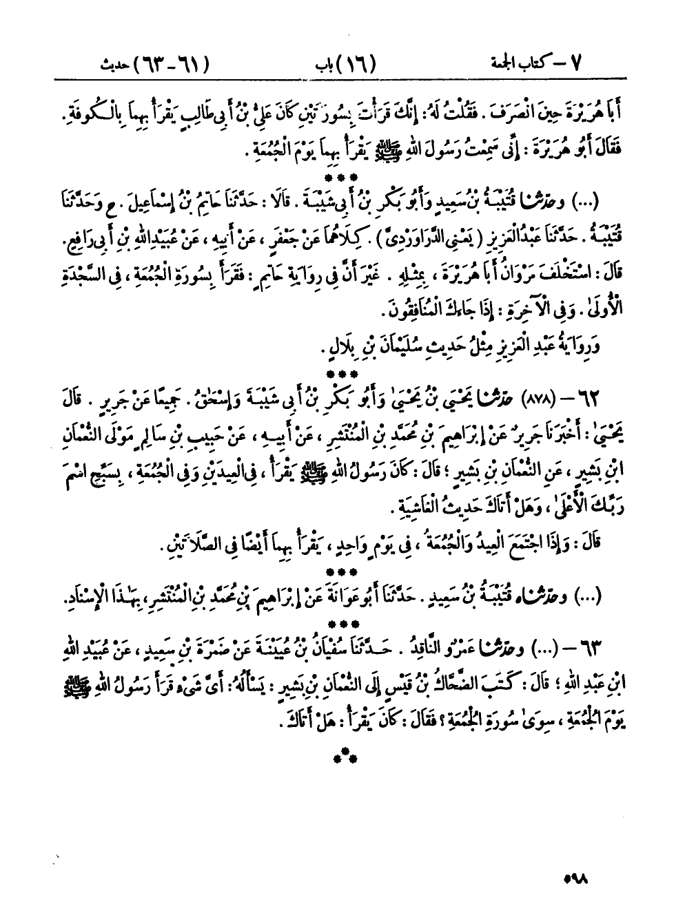 ٦٣ - (٨٧٨) وحَدَّثَنَا عَمْرٌو النَّاقِدُ، حَدَّثَنَا سُفْيَانُ بْنُ عُيَيْنَةَ، عَنْ ضَمْرَةَ بْنِ سَعِيدٍ، عَنْ عُبَيْدِ اللهِ بْنِ عَبْدِ اللهِ، قَالَ: كَتَبَ الضَّحَّاكُ بْنُ قَيْسٍ إِلَى النُّعْمَانِ بْنِ بَشِيرٍ يَسْأَلُهُ: أَيَّ شَيْءٍ قَرَأَ رَسُولُ اللهِ صَلَّى اللهُ عَلَيْهِ وَسَلَّمَ يَوْمَ الْجُمُعَةِ، سِوَى سُورَةِ الْجُمُعَةِ؟ فَقَالَ: «كَانَ يَقْرَأُ هَلْ أَتَاكَ»