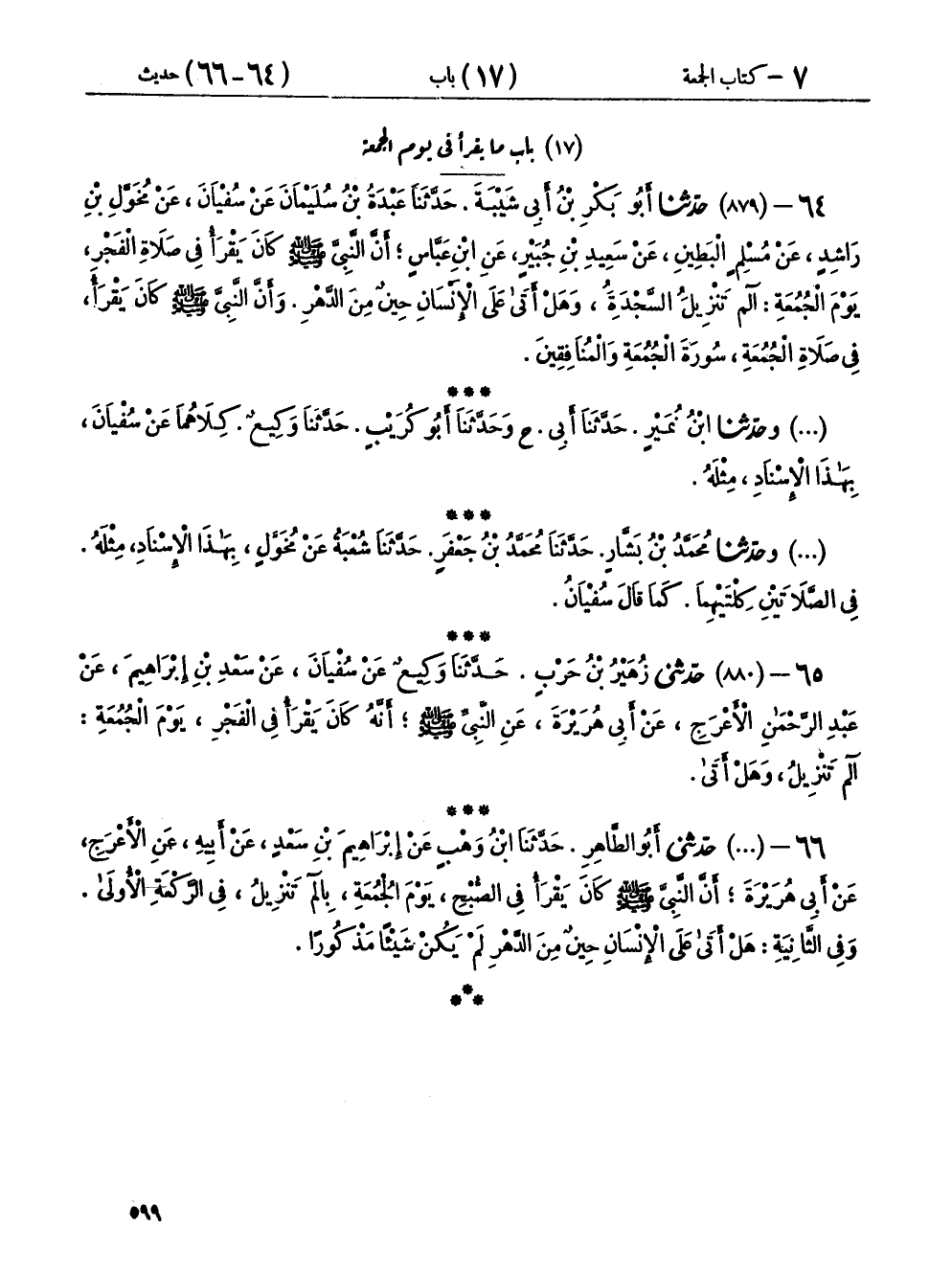 ٦٤ - (٨٧٩) حَدَّثَنَا أَبُو بَكْرِ بْنُ أَبِي شَيْبَةَ، حَدَّثَنَا عَبْدَةُ بْنُ سُلَيْمَانَ، عَنْ سُفْيَانَ، عَنْ مُخَوَّلِ بْنِ رَاشِدٍ، عَنْ مُسْلِمٍ الْبَطِينِ، عَنْ سَعِيدِ بْنِ جُبَيْرٍ، عَنِ ابْنِ عَبَّاسٍ، " أَنَّ النَّبِيَّ صَلَّى اللهُ عَلَيْهِ وَسَلَّمَ كَانَ يَقْرَأُ فِي صَلَاةِ الْفَجْرِ، يَوْمَ الْجُمُعَةِ: الم تَنْزِيلُ السَّجْدَةِ، وَهَلْ أَتَى عَلَى الْإِنْسَانِ حِينٌ مِنَ الدَّهْرِ، وَأَنَّ النَّبِيَّ صَلَّى اللهُ عَلَيْهِ وَسَلَّمَ كَانَ يَقْرَأُ فِي صَلَاةِ الْجُمُعَةِ سُورَةَ الْجُمُعَةِ، وَالْمُنَافِقِينَ ".