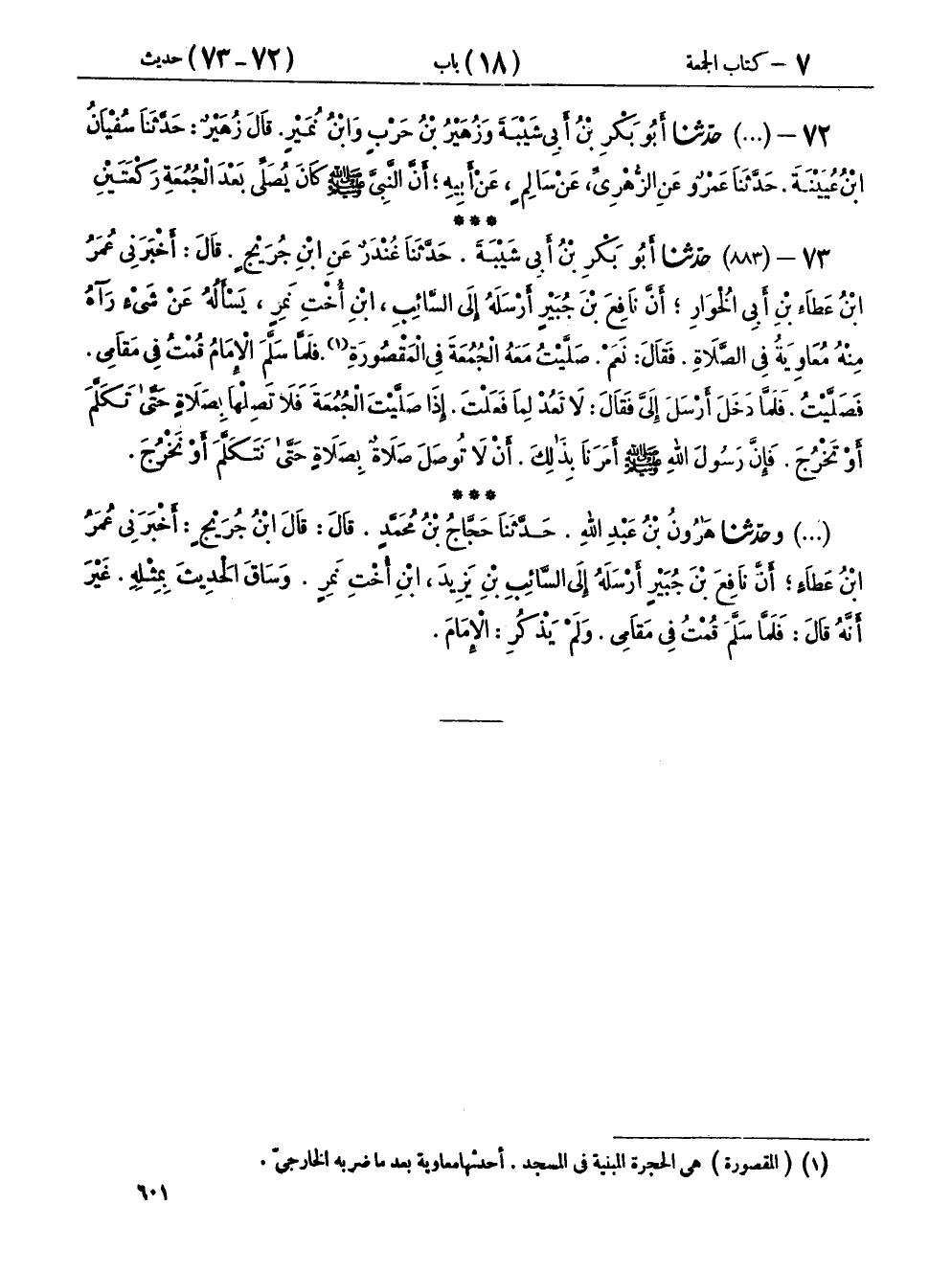 ٧٣ - (٨٨٣) حَدَّثَنَا أَبُو بَكْرِ بْنُ أَبِي شَيْبَةَ، حَدَّثَنَا غُنْدَرٌ، عَنِ ابْنِ جُرَيْجٍ، قَالَ: أَخْبَرَنِي عُمَرُ بْنُ عَطَاءِ بْنِ أَبِي الْخُوَارِ، أَنَّ نَافِعَ بْنَ جُبَيْرٍ، أَرْسَلَهُ إِلَى السَّائِبِ - ابْنِ أُخْتِ نَمِرٍ - يَسْأَلُهُ عَنْ شَيْءٍ رَآهُ مِنْهُ مُعَاوِيَةُ فِي الصَّلَاةِ، فَقَالَ: نَعَمْ، صَلَّيْتُ مَعَهُ الْجُمُعَةَ فِي الْمَقْصُورَةِ، فَلَمَّا سَلَّمَ الْإِمَامُ قُمْتُ فِي مَقَامِي، فَصَلَّيْتُ، فَلَمَّا دَخَلَ أَرْسَلَ إِلَيَّ، فَقَالَ: «لَا تَعُدْ لِمَا فَعَلْتَ، إِذَا صَلَّيْتَ الْجُمُعَةَ، فَلَا تَصِلْهَا بِصَلَاةٍ حَتَّى تَكَلَّمَ أَوْ تَخْرُجَ، فَإِنَّ رَسُولَ اللهِ صَلَّى اللهُ عَلَيْهِ وَسَلَّمَ أَمَرَنَا بِذَلِكَ، أَنْ لَا تُوصَلَ صَلَاةٌ بِصَلَاةٍ حَتَّى نَتَكَلَّمَ أَوْ نَخْرُجَ».