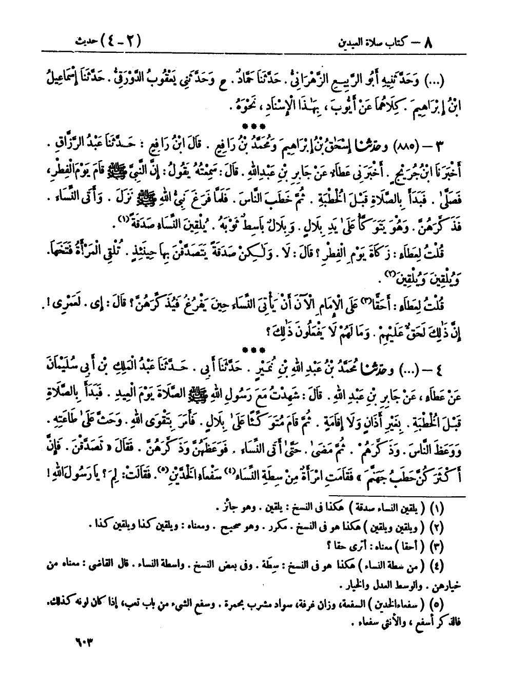 ٤ - (٨٨٥) وحَدَّثَنَا مُحَمَّدُ بْنُ عَبْدِ اللهِ بْنِ نُمَيْرٍ، حَدَّثَنَا أَبِي، حَدَّثَنَا عَبْدُ الْمَلِكِ بْنُ أَبِي سُلَيْمَانَ، عَنْ عَطَاءٍ، عَنْ جَابِرِ بْنِ عَبْدِ اللهِ، قَالَ: شَهِدْتُ مَعَ رَسُولِ اللهِ صَلَّى اللهُ عَلَيْهِ وَسَلَّمَ الصَّلَاةَ يَوْمَ الْعِيدِ، فَبَدَأَ بِالصَّلَاةِ قَبْلَ الْخُطْبَةِ، بِغَيْرِ أَذَانٍ وَلَا إِقَامَةٍ، ثُمَّ قَامَ مُتَوَكِّئًا عَلَى بِلَالٍ، فَأَمَرَ بِتَقْوَى اللهِ، وَحَثَّ عَلَى طَاعَتِهِ، وَوَعَظَ النَّاسَ وَذَكَّرَهُمْ، ثُمَّ مَضَى حَتَّى أَتَى النِّسَاءَ، فَوَعَظَهُنَّ وَذَكَّرَهُنَّ، فَقَالَ: «تَصَدَّقْنَ، فَإِنَّ أَكْثَرَكُنَّ حَطَبُ جَهَنَّمَ»، فَقَامَتِ امْرَأَةٌ مِنْ سِطَةِ النِّسَاءِ سَفْعَاءُ الْخَدَّيْنِ، فَقَالَتْ: لِمَ؟ يَا رَسُولَ اللهِ قَالَ: «لِأَنَّكُنَّ تُكْثِرْنَ الشَّكَاةَ، وَتَكْفُرْنَ الْعَشِيرَ»، قَالَ: فَجَعَلْنَ يَتَصَدَّقْنَ مِنْ حُلِيِّهِنَّ، يُلْقِينَ فِي ثَوْبِ بِلَالٍ مِنْ أَقْرِطَتِهِنَّ وَخَوَاتِمِهِنَّ