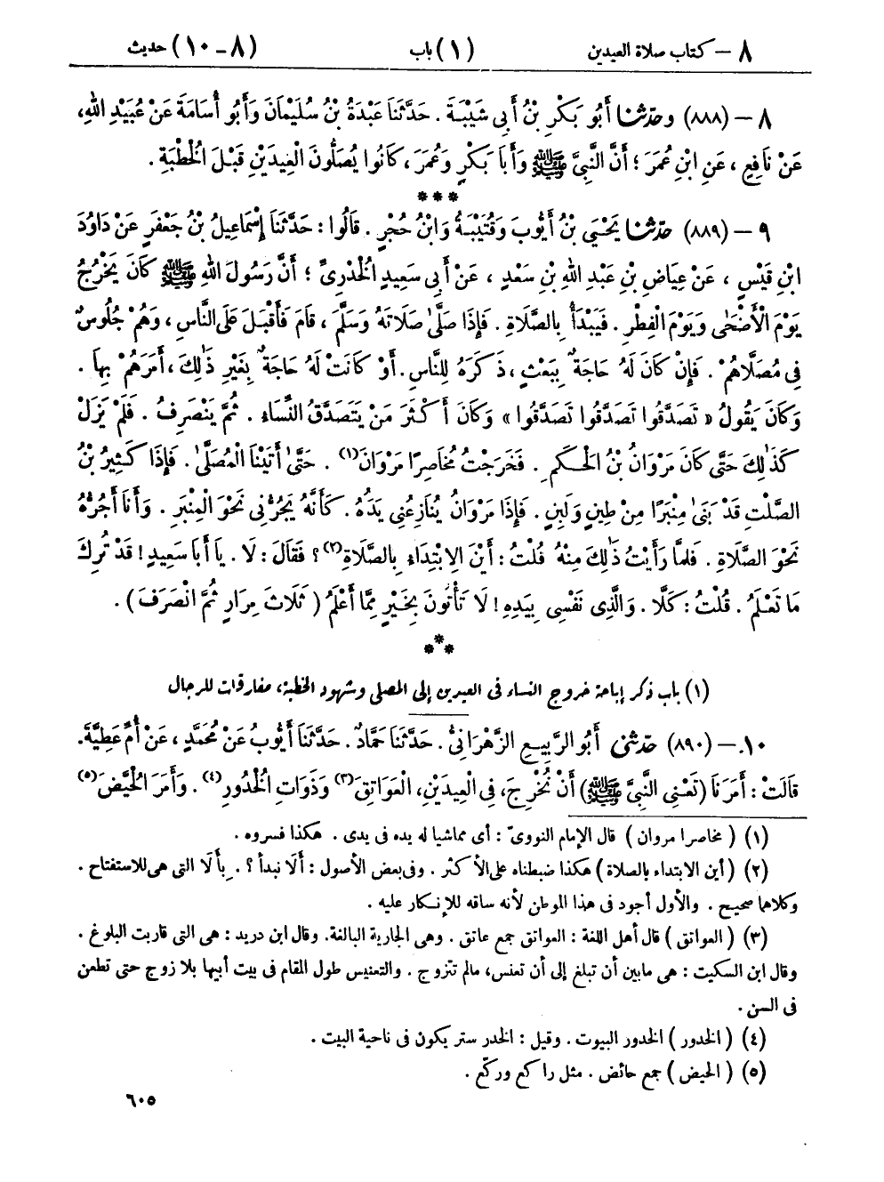 ١ - بَابُ ذِكْرِ إِبَاحَةِ خُرُوجِ النِّسَاءِ فِي الْعِيدَيْنِ إِلَى الْمُصَلَّى وَشُهُودِ الْخُطْبَةِ، مُفَارِقَاتٌ لِلرِّجَالِ