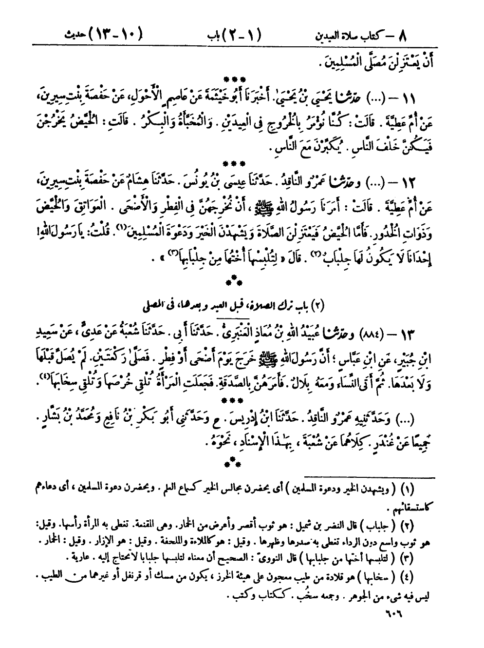 ١١ - (٨٩٠) حَدَّثَنَا يَحْيَى بْنُ يَحْيَى، أَخْبَرَنَا أَبُو خَيْثَمَةَ، عَنْ عَاصِمٍ الْأَحْوَلِ، عَنْ حَفْصَةَ بِنْتِ سِيرِينَ، عَنْ أُمِّ عَطِيَّةَ، قَالَتْ: «كُنَّا نُؤْمَرُ بِالْخُرُوجِ فِي الْعِيدَيْنِ، وَالْمُخَبَّأَةُ، وَالْبِكْرُ»، قَالَتْ: «الْحُيَّضُ يَخْرُجْنَ فَيَكُنَّ خَلْفَ النَّاسِ، يُكَبِّرْنَ مَعَ النَّاسِ»