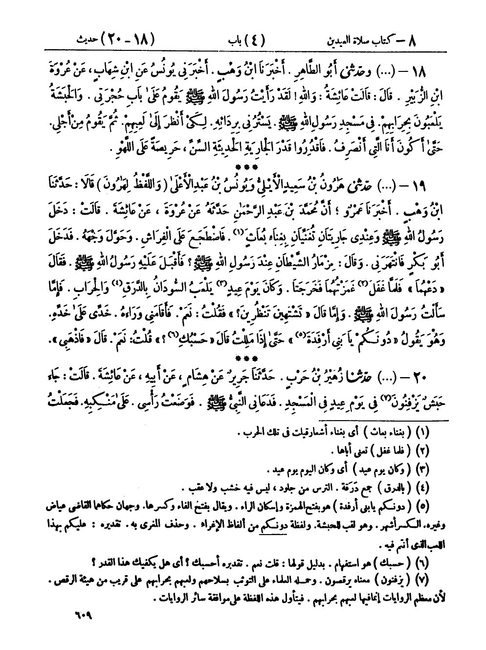 ١٩ - (٨٩٢) حَدَّثَنِي هَارُونُ بْنُ سَعِيدٍ الْأَيْلِيُّ، وَيُونُسُ بْنُ عَبْدِ الْأَعْلَى، وَاللَّفْظُ لِهَارُونَ، قَالَا: حَدَّثَنَا ابْنُ وَهْبٍ، أَخْبَرَنَا عَمْرٌو، أَنَّ مُحَمَّدَ بْنَ عَبْدِ الرَّحْمَنِ، حَدَّثَهُ عَنْ عُرْوَةَ، عَنْ عَائِشَةَ، قَالَتْ: دَخَلَ رَسُولُ اللهِ صَلَّى اللهُ عَلَيْهِ وَسَلَّمَ وَعِنْدِي جَارِيَتَانِ، تُغَنِّيَانِ بِغِنَاءِ بُعَاثٍ، فَاضْطَجَعَ عَلَى الْفِرَاشِ، وَحَوَّلَ وَجْهَهُ، فَدَخَلَ أَبُو بَكْرٍ فَانْتَهَرَنِي، وَقَالَ: مِزْمَارُ الشَّيْطَانِ عِنْدَ رَسُولِ اللهِ صَلَّى اللهُ عَلَيْهِ وَسَلَّمَ؟ فَأَقْبَلَ عَلَيْهِ رَسُولُ اللهِ صَلَّى اللهُ عَلَيْهِ وَسَلَّمَ، فَقَالَ: «دَعْهُمَا»، فَلَمَّا غَفَلَ غَمَزْتُهُمَا فَخَرَجَتَا، وَكَانَ يَوْمَ عِيدٍ يَلْعَبُ السُّودَانُ بِالدَّرَقِ وَالْحِرَابِ، فَإِمَّا سَأَلْتُ رَسُولَ اللهِ صَلَّى اللهُ عَلَيْهِ وَسَلَّمَ، وَإِمَّا قَالَ: «تَشْتَهِينَ تَنْظُرِينَ؟» فَقُلْتُ: نَعَمْ، فَأَقَامَنِي وَرَاءَهُ، خَدِّي عَلَى خَدِّهِ، وَهُوَ يَقُولُ: «دُونَكُمْ يَا بَنِي أَرْفِدَةَ» حَتَّى إِذَا مَلِلْتُ، قَالَ: «حَسْبُكِ؟» قُلْتُ: نَعَمْ، قَالَ: «فَاذْهَبِي»