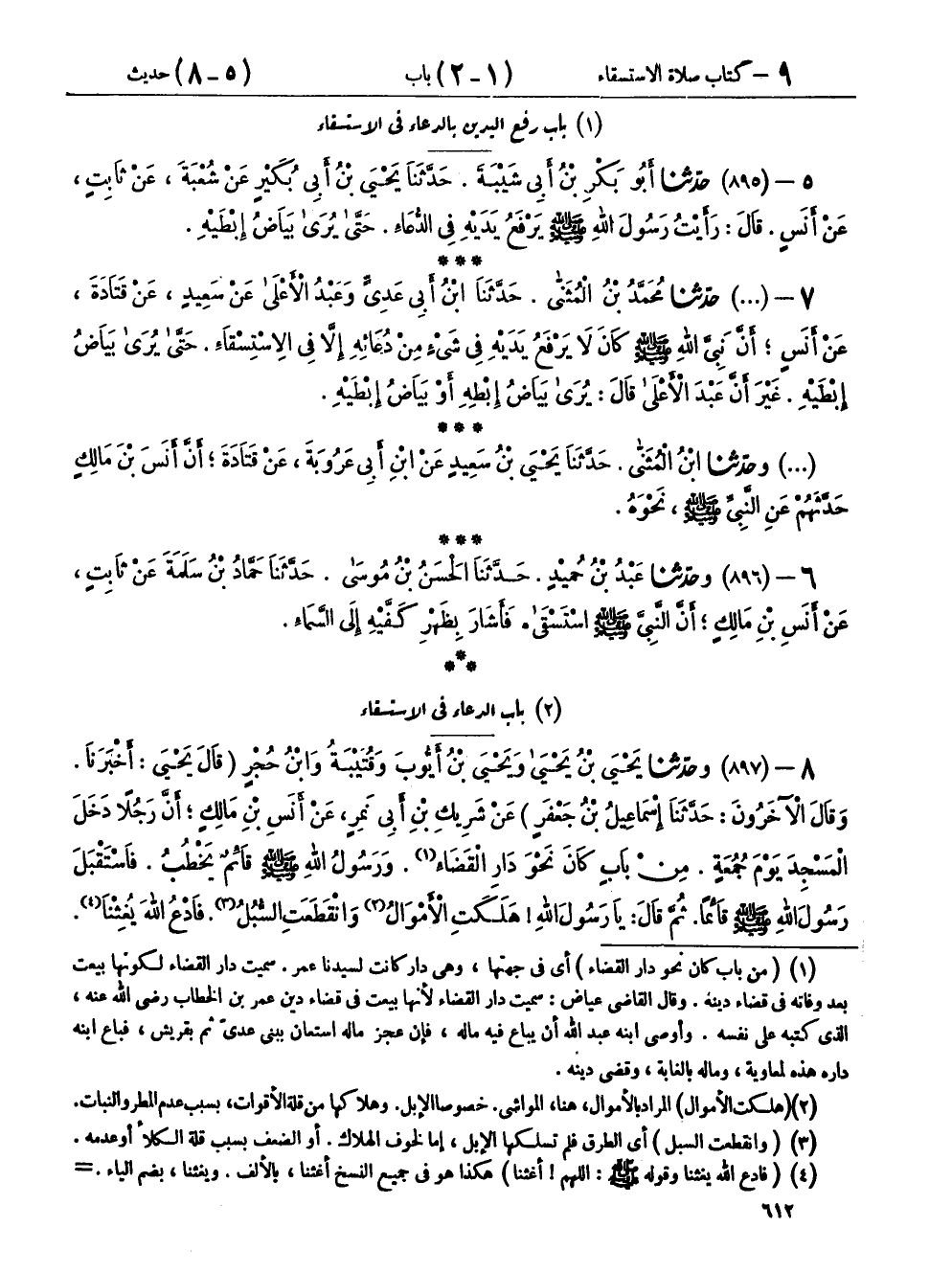 ٥ - (٨٩٥) حَدَّثَنَا أَبُو بَكْرِ بْنُ أَبِي شَيْبَةَ، حَدَّثَنَا يَحْيَى بْنُ أَبِي بُكَيْرٍ، عَنْ شُعْبَةَ، عَنْ ثَابِتٍ، عَنْ أَنَسٍ، قَالَ: «رَأَيْتُ رَسُولَ اللهِ صَلَّى اللهُ عَلَيْهِ وَسَلَّمَ يَرْفَعُ يَدَيْهِ فِي الدُّعَاءِ، حَتَّى يُرَى بَيَاضُ إِبْطَيْهِ»