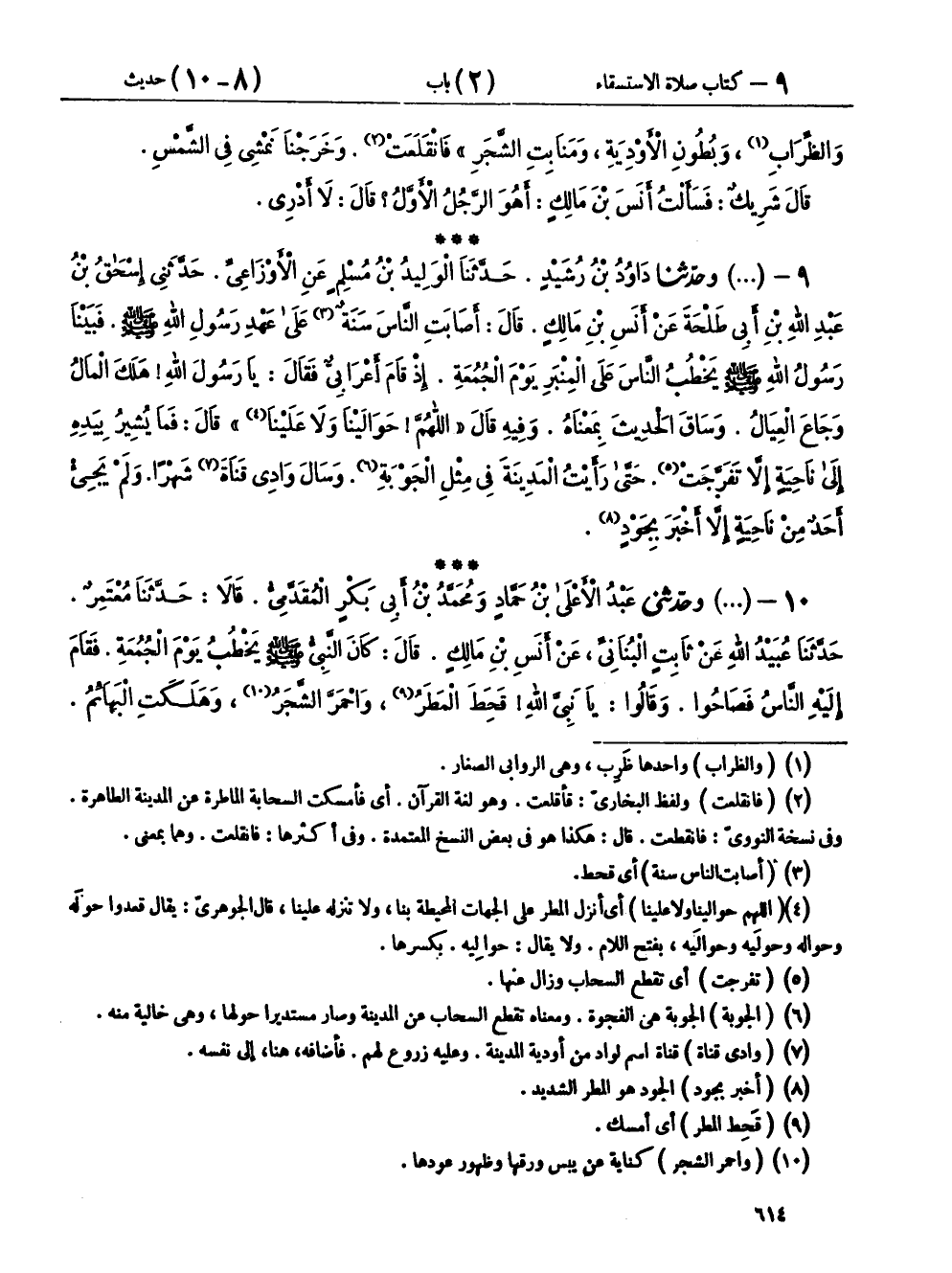 ٩ - (٨٩٧) وحَدَّثَنَا دَاوُدُ بْنُ رُشَيْدٍ، حَدَّثَنَا الْوَلِيدُ بْنُ مُسْلِمٍ، عَنِ الْأَوْزَاعِيِّ، حَدَّثَنِي إِسْحَاقُ بْنُ عَبْدِ اللهِ بْنِ أَبِي طَلْحَةَ، عَنْ أَنَسِ بْنِ مَالِكٍ، قَالَ: أَصَابَتِ النَّاسَ سَنَةٌ عَلَى عَهْدِ رَسُولِ اللهِ صَلَّى اللهُ عَلَيْهِ وَسَلَّمَ، فَبَيْنَا رَسُولُ اللهِ صَلَّى اللهُ عَلَيْهِ وَسَلَّمَ يَخْطُبُ النَّاسَ عَلَى الْمِنْبَرِ يَوْمَ الْجُمُعَةِ، إِذْ قَامَ أَعْرَابِيٌّ، فَقَالَ يَا رَسُولَ اللهِ هَلَكَ الْمَالُ، وَجَاعَ الْعِيَالُ، وَسَاقَ الْحَدِيثَ بِمَعْنَاهُ، وَفِيهِ قَالَ «اللهُمَّ حَوَالَيْنَا وَلَا عَلَيْنَا»، قَالَ: فَمَا يُشِيرُ بِيَدِهِ إِلَى نَاحِيَةٍ إِلَّا تَفَرَّجَتْ، حَتَّى رَأَيْتُ الْمَدِينَةَ فِي مِثْلِ الْجَوْبَةِ وَسَالَ وَادِي قَنَاةَ شَهْرًا، وَلَمْ يَجِئْ أَحَدٌ مِنْ نَاحِيَةٍ إِلَّا أَخْبَرَ بِجَوْدٍ.