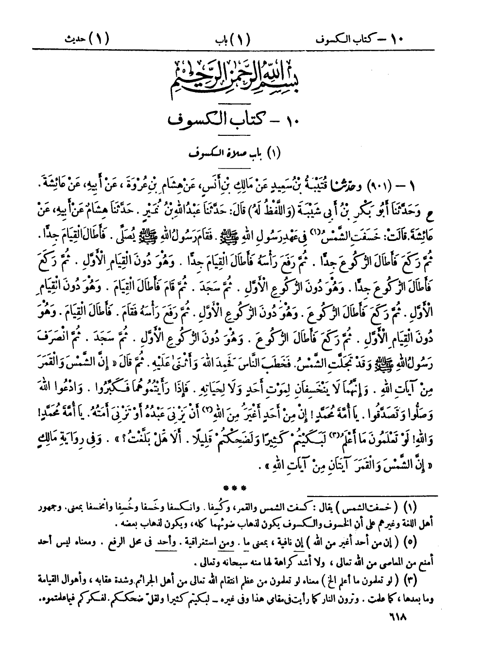 ١ - (٩٠١) وحَدَّثَنَا قُتَيْبَةُ بْنُ سَعِيدٍ، عَنْ مَالِكِ بْنِ أَنَسٍ، عَنْ هِشَامِ بْنِ عُرْوَةَ، عَنْ أَبِيهِ، عَنْ عَائِشَةَ، ح وحَدَّثَنَا أَبُو بَكْرِ بْنُ أَبِي شَيْبَةَ، وَاللَّفْظُ لَهُ، قَالَ: حَدَّثَنَا عَبْدُ اللهِ بْنُ نُمَيْرٍ، حَدَّثَنَا هِشَامٌ، عَنْ أَبِيهِ، عَنْ عَائِشَةَ، قَالَتْ: خَسَفَتِ الشَّمْسُ فِي عَهْدِ رَسُولِ اللهِ صَلَّى اللهُ عَلَيْهِ وَسَلَّمَ، فَقَامَ رَسُولُ اللهِ صَلَّى اللهُ عَلَيْهِ وَسَلَّمَ يُصَلِّي، فَأَطَالَ الْقِيَامَ جِدًّا، ثُمَّ رَكَعَ، فَأَطَالَ الرُّكُوعَ جِدًّا، ثُمَّ رَفَعَ رَأْسَهُ، فَأَطَالَ الْقِيَامَ جِدًّا، وَهُوَ دُونَ الْقِيَامِ الْأَوَّلِ، ثُمَّ رَكَعَ فَأَطَالَ الرُّكُوعَ جِدًّا، وَهُوَ دُونَ الرُّكُوعِ الْأَوَّلِ، ثُمَّ سَجَدَ، ثُمَّ قَامَ، فَأَطَالَ الْقِيَامَ، وَهُوَ دُونَ الْقِيَامِ الْأَوَّلِ، ثُمَّ رَكَعَ، فَأَطَالَ الرُّكُوعَ وَهُوَ دُونَ الرُّكُوعِ الْأَوَّلِ، ثُمَّ رَفَعَ رَأْسَهُ، فَقَامَ فَأَطَالَ الْقِيَامَ وَهُوَ دُونَ الْقِيَامِ الْأَوَّلِ، ثُمَّ رَكَعَ، فَأَطَالَ الرُّكُوعَ وَهُوَ دُونَ الرُّكُوعِ الْأَوَّلِ، ثُمَّ سَجَدَ، ثُمَّ انْصَرَفَ رَسُولُ اللهِ صَلَّى اللهُ عَلَيْهِ وَسَلَّمَ، وَقَدْ تَجَلَّتِ الشَّمْسُ، فَخَطَبَ النَّاسَ، فَحَمِدَ اللهَ وَأَثْنَى عَلَيْهِ، ثُمَّ قَالَ: «إِنَّ الشَّمْسَ وَالْقَمَرَ مِنْ آيَاتِ اللهِ، وَإِنَّهُمَا لَا يَنْخَسِفَانِ لِمَوْتِ أَحَدٍ، وَلَا لِحَيَاتِهِ، فَإِذَا رَأَيْتُمُوهُمَا فَكَبِّرُوا، وَادْعُوا اللهَ وَصَلُّوا وَتَصَدَّقُوا، يَا أُمَّةَ مُحَمَّدٍ إِنْ مِنْ أَحَدٍ أَغْيَرَ مِنَ اللهِ أَنْ يَزْنِيَ عَبْدُهُ، أَوْ تَزْنِيَ أَمَتُهُ، يَا أُمَّةَ مُحَمَّدٍ وَاللهِ لَوْ تَعْلَمُونَ مَا أَعْلَمُ لَبَكَيْتُمْ كَثِيرًا، وَلَضَحِكْتُمْ قَلِيلًا، أَلَا هَلْ بَلَّغْتُ؟». وَفِي رِوَايَةِ مَالِكٍ: «إِنَّ الشَّمْسَ وَالْقَمَرَ آيَتَانِ مِنْ آيَاتِ اللهِ».