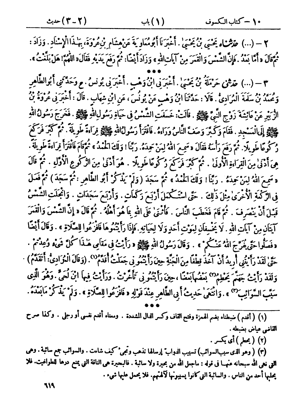 ٣ - (٩٠١) حَدَّثَنِي حَرْمَلَةُ بْنُ يَحْيَى، أَخْبَرَنِي ابْنُ وَهْبٍ، أَخْبَرَنِي يُونُسُ، ح وحَدَّثَنِي أَبُو الطَّاهِرِ، وَمُحَمَّدُ بْنُ سَلَمَةَ الْمُرَادِيُّ، قَالَا: حَدَّثَنَا ابْنُ وَهْبٍ، عَنْ يُونُسَ، عَنِ ابْنِ شِهَابٍ، قَالَ: أَخْبَرَنِي عُرْوَةُ بْنُ الزُّبَيْرِ، عَنْ عَائِشَةَ، زَوْجِ النَّبِيِّ صَلَّى اللهُ عَلَيْهِ وَسَلَّمَ، قَالَتْ: خَسَفَتِ الشَّمْسُ فِي حَيَاةِ رَسُولِ اللهِ صَلَّى اللهُ عَلَيْهِ وَسَلَّمَ، فَخَرَجَ رَسُولُ اللهِ صَلَّى اللهُ عَلَيْهِ وَسَلَّمَ إِلَى الْمَسْجِدِ، فَقَامَ وَكَبَّرَ، وَصَفَّ النَّاسُ وَرَاءَهُ، فَاقْتَرَأَ رَسُولُ اللهِ صَلَّى اللهُ عَلَيْهِ وَسَلَّمَ قِرَاءَةً طَوِيلَةً، ثُمَّ كَبَّرَ فَرَكَعَ رُكُوعًا طَوِيلًا، ثُمَّ رَفَعَ رَأْسَهُ، فَقَالَ: «سَمِعَ اللهُ لِمَنْ حَمِدَهُ، رَبَّنَا وَلَكَ الْحَمْدُ»، ثُمَّ قَامَ، فَاقْتَرَأَ قِرَاءَةً طَوِيلَةً هِيَ أَدْنَى مِنَ الْقِرَاءَةِ الْأُولَى، ثُمَّ كَبَّرَ، فَرَكَعَ رُكُوعًا طَوِيلًا هُوَ أَدْنَى مِنَ الرُّكُوعِ الْأَوَّلِ، ثُمَّ قَالَ: «سَمِعَ اللهُ لِمَنْ حَمِدَهُ، رَبَّنَا وَلَكَ الْحَمْدُ»، ثُمَّ سَجَدَ - وَلَمْ يَذْكُرْ أَبُو الطَّاهِرِ: ثُمَّ سَجَدَ - ثُمَّ فَعَلَ فِي الرَّكْعَةِ الْأُخْرَى مِثْلَ ذَلِكَ، حَتَّى اسْتَكْمَلَ أَرْبَعَ رَكَعَاتٍ، وَأَرْبَعَ سَجَدَاتٍ، وَانْجَلَتِ الشَّمْسُ قَبْلَ أَنْ يَنْصَرِفَ، ثُمَّ قَامَ فَخَطَبَ النَّاسَ، فَأَثْنَى عَلَى اللهِ بِمَا هُوَ أَهْلُهُ، ثُمَّ قَالَ: «إِنَّ الشَّمْسَ وَالْقَمَرَ آيَتَانِ مِنْ آيَاتِ اللهِ، لَا يَخْسِفَانِ لِمَوْتِ أَحَدٍ، وَلَا لِحَيَاتِهِ، فَإِذَا رَأَيْتُمُوهَا فَافْزَعُوا لِلصَّلَاةِ»، وَقَالَ أَيْضًا: «فَصَلُّوا حَتَّى يُفَرِّجَ اللهُ عَنْكُمْ»، وَقَالَ رَسُولُ اللهِ صَلَّى اللهُ عَلَيْهِ وَسَلَّمَ: " رَأَيْتُ فِي مَقَامِي هَذَا كُلَّ شَيْءٍ وُعِدْتُمْ، حَتَّى لَقَدْ رَأَيْتُنِي أُرِيدُ أَنْ آخُذَ قِطْفًا مِنَ الْجَنَّةِ حِينَ رَأَيْتُمُونِي جَعَلْتُ أُقَدِّمُ - وقَالَ الْمُرَادِيُّ: أَتَقَدَّمُ - وَلَقَدْ رَأَيْتُ جَهَنَّمَ يَحْطِمُ بَعْضُهَا بَعْضًا، حِينَ رَأَيْتُمُونِي تَأَخَّرْتُ، وَرَأَيْتُ فِيهَا ابْنَ لُحَيٍّ، وَهُوَ الَّذِي سَيَّبَ السَّوَائِبَ «. وَانْتَهَى حَدِيثُ أَبِي الطَّاهِرِ عِنْدَ قَوْلِهِ» فَافْزَعُوا لِلصَّلَاةِ "، وَلَمْ يَذْكُرْ مَا بَعْدَهُ