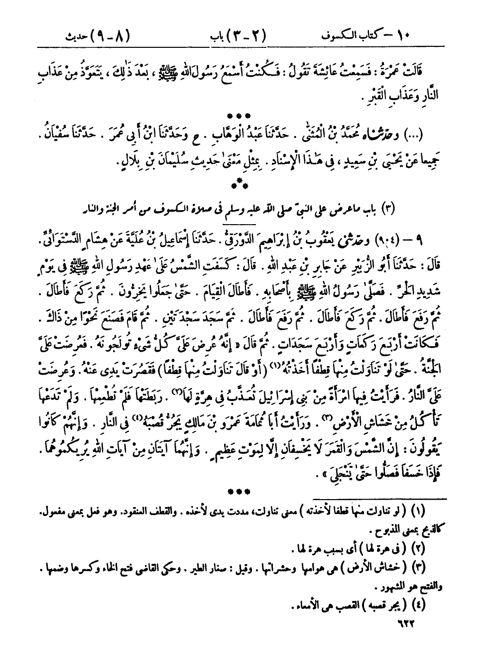 ٩ - (٩٠٤) وحَدَّثَنِي يَعْقُوبُ بْنُ إِبْرَاهِيمَ الدَّوْرَقِيُّ، حَدَّثَنَا إِسْمَاعِيلُ ابْنُ عُلَيَّةَ، عَنْ هِشَامٍ الدَّسْتَوَائِيِّ، قَالَ: حَدَّثَنَا أَبُو الزُّبَيْرِ، عَنْ جَابِرِ بْنِ عَبْدِ اللهِ، قَالَ: كَسَفَتِ الشَّمْسُ عَلَى عَهْدِ رَسُولِ اللهِ صَلَّى اللهُ عَلَيْهِ وَسَلَّمَ فِي يَوْمٍ شَدِيدِ الْحَرِّ، فَصَلَّى رَسُولُ اللهِ صَلَّى اللهُ عَلَيْهِ وَسَلَّمَ بِأَصْحَابِهِ، فَأَطَالَ الْقِيَامَ، حَتَّى جَعَلُوا يَخِرُّونَ، ثُمَّ رَكَعَ فَأَطَالَ، ثُمَّ رَفَعَ فَأَطَالَ، ثُمَّ رَكَعَ فَأَطَالَ، ثُمَّ رَفَعَ فَأَطَالَ، ثُمَّ سَجَدَ سَجْدَتَيْنِ، ثُمَّ قَامَ فَصَنَعَ نَحْوًا مِنْ ذَاكَ، فَكَانَتْ أَرْبَعَ رَكَعَاتٍ، وَأَرْبَعَ سَجَدَاتٍ، ثُمَّ قَالَ: " إِنَّهُ عُرِضَ عَلَيَّ كُلُّ شَيْءٍ تُولَجُونَهُ، فَعُرِضَتْ عَلَيَّ الْجَنَّةُ، حَتَّى لَوْ تَنَاوَلْتُ مِنْهَا قِطْفًا أَخَذْتُهُ - أَوْ قَالَ: تَنَاوَلْتُ مِنْهَا قِطْفًا - فَقَصُرَتْ يَدِي عَنْهُ، وَعُرِضَتْ عَلَيَّ النَّارُ، فَرَأَيْتُ فِيهَا امْرَأَةً مِنْ بَنِي إِسْرَائِيلَ تُعَذَّبُ فِي هِرَّةٍ لَهَا، رَبَطَتْهَا فَلَمْ تُطْعِمْهَا، وَلَمْ تَدَعْهَا تَأْكُلُ مِنْ خَشَاشِ الْأَرْضِ، وَرَأَيْتُ أَبَا ثُمَامَةَ عَمْرَو بْنَ مَالِكٍ يَجُرُّ قُصْبَهُ فِي النَّارِ، وَإِنَّهُمْ كَانُوا يَقُولُونَ: إِنَّ الشَّمْسَ وَالْقَمَرَ لَا يَخْسِفَانِ إِلَّا لِمَوْتِ عَظِيمٍ، وَإِنَّهُمَا آيَتَانِ مِنْ آيَاتِ اللهِ يُرِيكُمُوهُمَا، فَإِذَا خَسَفَا فَصَلُّوا حَتَّى تَنْجَلِيَ ".