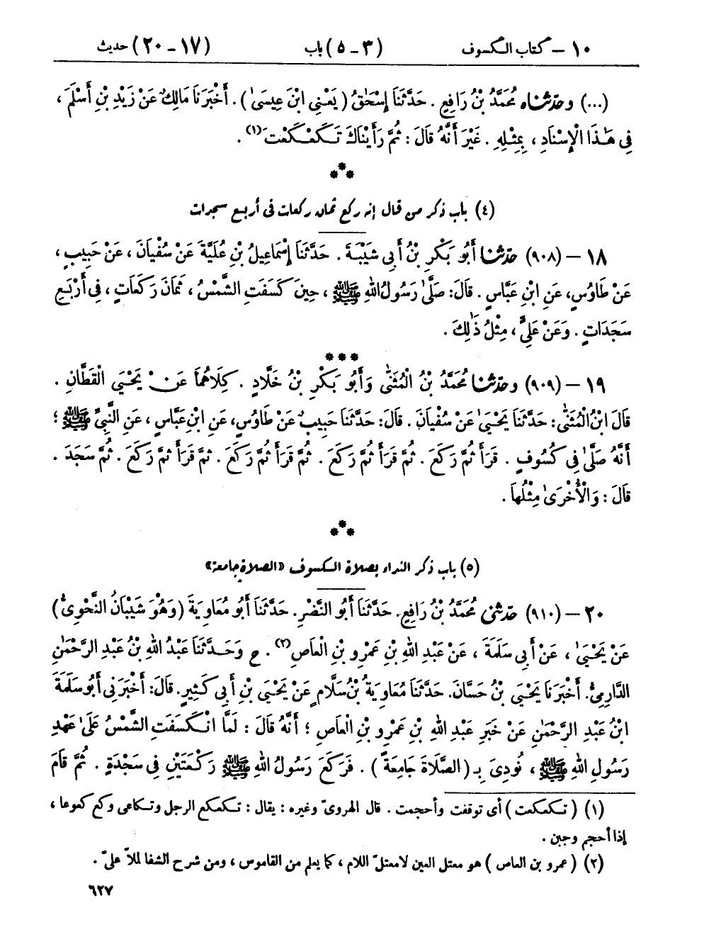 ٢٠ - (٩١٠) حَدَّثَنِي مُحَمَّدُ بْنُ رَافِعٍ، حَدَّثَنَا أَبُو النَّضْرِ، حَدَّثَنَا أَبُو مُعَاوِيَةَ وَهُوَ شَيْبَانُ النَّحْوِيُّ، عَنْ يَحْيَى، عَنْ أَبِي سَلَمَةَ، عَنْ عَبْدِ اللهِ بْنِ عَمْرِو بْنِ الْعَاصِ، ح وحَدَّثَنَا عَبْدُ اللهِ بْنُ عَبْدِ الرَّحْمَنِ الدَّارِمِيُّ، أَخْبَرَنَا يَحْيَى بْنُ حَسَّانَ، حَدَّثَنَا مُعَاوِيَةُ بْنُ سَلَّامٍ، عَنْ يَحْيَى بْنِ أَبِي كَثِيرٍ، قَالَ: أَخْبَرَنِي أَبُو سَلَمَةَ بْنُ عَبْدِ الرَّحْمَنِ، عَنْ خَبَرِ عَبْدِ اللهِ بْنِ عَمْرِو بْنِ الْعَاصِ، أَنَّهُ قَالَ: «لَمَّا انْكَسَفَتِ الشَّمْسُ عَلَى عَهْدِ رَسُولِ اللهِ صَلَّى اللهُ عَلَيْهِ وَسَلَّمَ، نُودِيَ بِالصَّلَاةَ جَامِعَةً، فَرَكَعَ رَسُولُ اللهِ صَلَّى اللهُ عَلَيْهِ وَسَلَّمَ رَكْعَتَيْنِ فِي سَجْدَةٍ، ثُمَّ قَامَ فَرَكَعَ رَكْعَتَيْنِ فِي سَجْدَةٍ، ثُمَّ جُلِّيَ عَنِ الشَّمْسِ» فَقَالَتْ عَائِشَةُ: مَا رَكَعْتُ رُكُوعًا قَطُّ، وَلَا سَجَدْتُ سُجُودًا قَطُّ، كَانَ أَطْوَلَ مِنْهُ