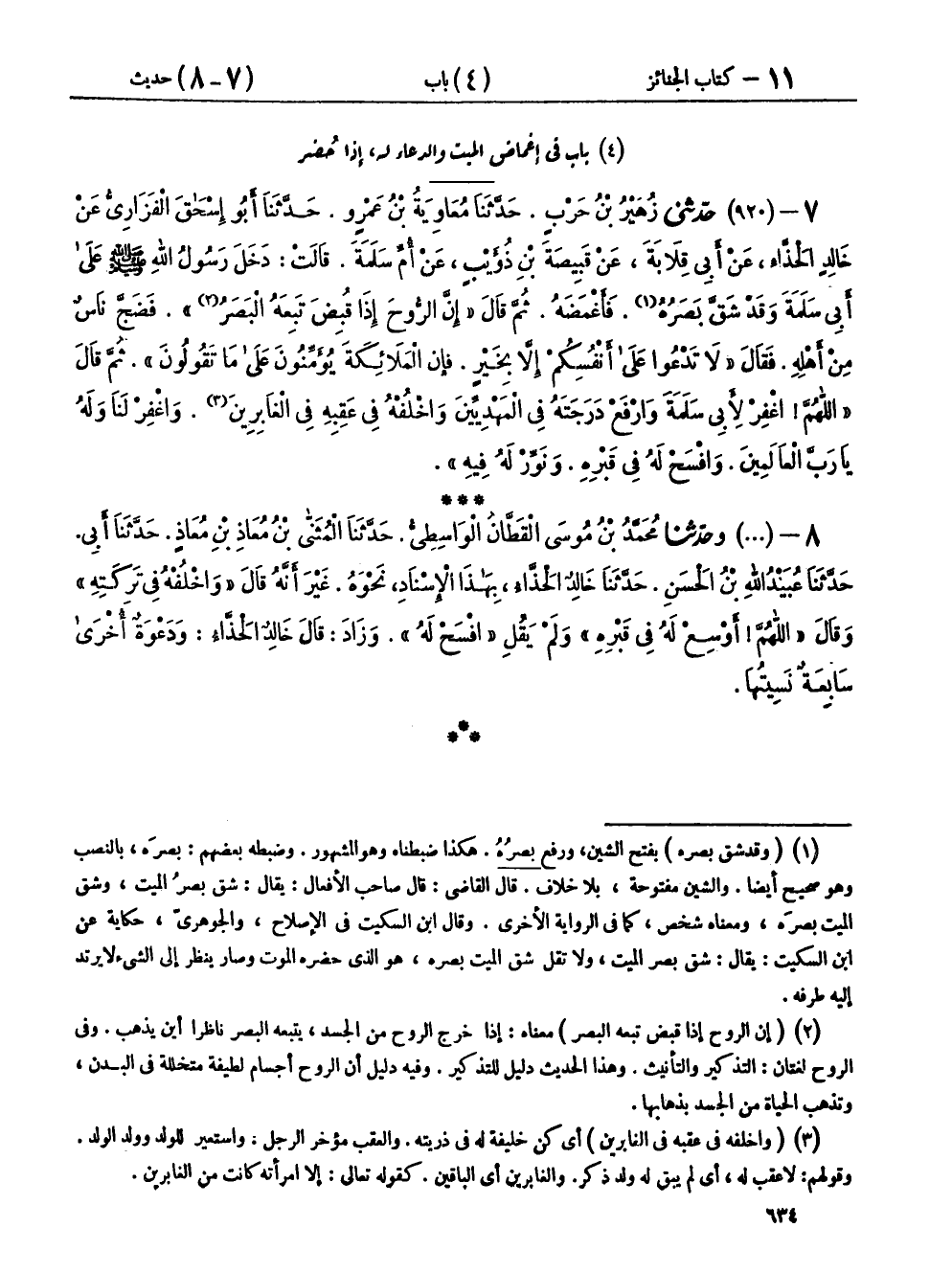 ٧ - (٩٢٠) حَدَّثَنِي زُهَيْرُ بْنُ حَرْبٍ، حَدَّثَنَا مُعَاوِيَةُ بْنُ عَمْرٍو، حَدَّثَنَا أَبُو إِسْحَاقَ الْفَزَارِيُّ، عَنْ خَالِدٍ الْحَذَّاءِ، عَنْ أَبِي قِلَابَةَ، عَنْ قَبِيصَةَ بْنِ ذُؤَيْبٍ، عَنْ أُمِّ سَلَمَةَ، قَالَتْ: دَخَلَ رَسُولُ اللهِ صَلَّى اللهُ عَلَيْهِ وَسَلَّمَ عَلَى أَبِي سَلَمَةَ وَقَدْ شَقَّ بَصَرُهُ، فَأَغْمَضَهُ، ثُمَّ قَالَ: «إِنَّ الرُّوحَ إِذَا قُبِضَ تَبِعَهُ الْبَصَرُ»، فَضَجَّ نَاسٌ مِنْ أَهْلِهِ، فَقَالَ: «لَا تَدْعُوا عَلَى أَنْفُسِكُمْ إِلَّا بِخَيْرٍ، فَإِنَّ الْمَلَائِكَةَ يُؤَمِّنُونَ عَلَى مَا تَقُولُونَ»، ثُمَّ قَالَ: «اللهُمَّ اغْفِرْ لِأَبِي سَلَمَةَ وَارْفَعْ دَرَجَتَهُ فِي الْمَهْدِيِّينَ، وَاخْلُفْهُ فِي عَقِبِهِ فِي الْغَابِرِينَ، وَاغْفِرْ لَنَا وَلَهُ يَا رَبَّ الْعَالَمِينَ، وَافْسَحْ لَهُ فِي قَبْرِهِ، وَنَوِّرْ لَهُ فِيهِ».