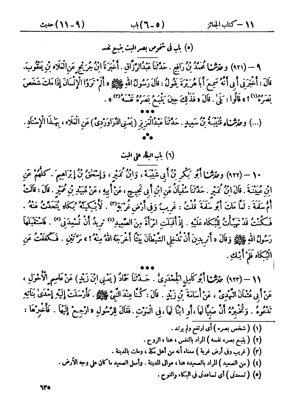 ١١ - (٩٢٣) حَدَّثَنَا أَبُو كَامِلٍ الْجَحْدَرِيُّ، حَدَّثَنَا حَمَّادٌ يَعْنِي ابْنَ زَيْدٍ، عَنْ عَاصِمٍ الْأَحْوَلِ، عَنْ أَبِي عُثْمَانَ النَّهْدِيِّ، عَنْ أُسَامَةَ بْنِ زَيْدٍ، قَالَ: كُنَّا عِنْدَ النَّبِيِّ صَلَّى اللهُ عَلَيْهِ وَسَلَّمَ، فَأَرْسَلَتْ إِلَيْهِ إِحْدَى بَنَاتِهِ تَدْعُوهُ، وَتُخْبِرُهُ أَنَّ صَبِيًّا لَهَا، أَوِ ابْنًا لَهَا فِي الْمَوْتِ، فَقَالَ لِلرَّسُولِ: " ارْجِعْ إِلَيْهَا، فَأَخْبِرْهَا: أَنَّ لِلَّهِ مَا أَخَذَ وَلَهُ مَا أَعْطَى، وَكُلُّ شَيْءٍ عِنْدَهُ بِأَجَلٍ مُسَمًّى، فَمُرْهَا فَلْتَصْبِرْ وَلْتَحْتَسِبْ "، فَعَادَ الرَّسُولُ، فَقَالَ: إِنَّهَا قَدْ أَقْسَمَتْ لَتَأْتِيَنَّهَا، قَالَ: فَقَامَ النَّبِيُّ صَلَّى اللهُ عَلَيْهِ وَسَلَّمَ، وَقَامَ مَعَهُ سَعْدُ بْنُ عُبَادَةَ، وَمُعَاذُ بْنُ جَبَلٍ، وَانْطَلَقْتُ مَعَهُمْ، فَرُفِعَ إِلَيْهِ الصَّبِيُّ وَنَفْسُهُ تَقَعْقَعُ كَأَنَّهَا فِي شَنَّةٍ، فَفَاضَتْ عَيْنَاهُ، فَقَالَ لَهُ سَعْدٌ: مَا هَذَا؟ يَا رَسُولَ اللهِ قَالَ: «هَذِهِ رَحْمَةٌ جَعَلَهَا اللهُ فِي قُلُوبِ عِبَادِهِ، وَإِنَّمَا يَرْحَمُ اللهُ مِنْ عِبَادِهِ الرُّحَمَاءَ».