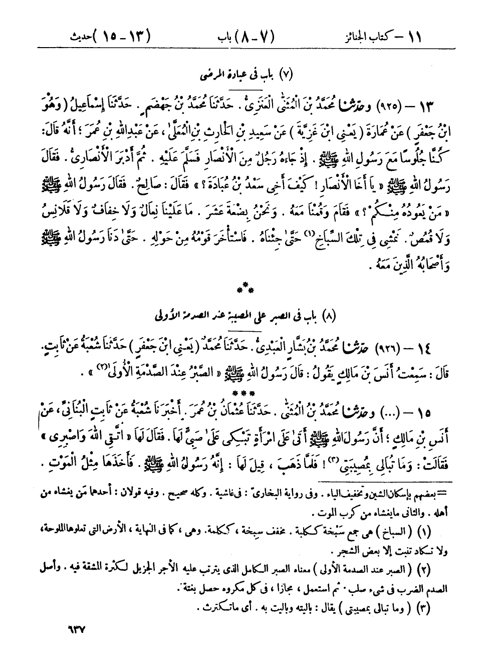 ١٣ - (٩٢٥) وحَدَّثَنَا مُحَمَّدُ بْنُ الْمُثَنَّى الْعَنَزِيُّ، حَدَّثَنَا مُحَمَّدُ بْنُ جَهْضَمٍ، حَدَّثَنَا إِسْمَاعِيلُ وَهُوَ ابْنُ جَعْفَرٍ، عَنْ عُمَارَةَ يَعْنِي ابْنَ غَزِيَّةَ، عَنْ سَعِيدِ بْنِ الْحَارِثِ بْنِ الْمُعَلَّى، عَنْ عَبْدِ اللهِ بْنِ عُمَرَ، أَنَّهُ قَالَ: كُنَّا جُلُوسًا مَعَ رَسُولِ اللهِ صَلَّى اللهُ عَلَيْهِ وَسَلَّمَ إِذْ جَاءَهُ رَجُلٌ مِنَ الْأَنْصَارِ، فَسَلَّمَ عَلَيْهِ، ثُمَّ أَدْبَرَ الْأَنْصَارِيُّ، فَقَالَ رَسُولُ اللهِ صَلَّى اللهُ عَلَيْهِ وَسَلَّمَ: " يَا أَخَا الْأَنْصَارِ كَيْفَ أَخِي سَعْدُ بْنُ عُبَادَةَ؟، فَقَالَ: صَالِحٌ، فَقَالَ رَسُولُ اللهِ صَلَّى اللهُ عَلَيْهِ وَسَلَّمَ: «مَنْ يَعُودُهُ مِنْكُمْ؟» فَقَامَ، وَقُمْنَا مَعَهُ، وَنَحْنُ بِضْعَةَ عَشَرَ، مَا عَلَيْنَا نِعَالٌ، وَلَا خِفَافٌ، وَلَا قَلَانِسُ، وَلَا قُمُصٌ، نَمْشِي فِي تِلْكَ السِّبَاخِ حَتَّى جِئْنَاهُ، فَاسْتَأْخَرَ قَوْمُهُ مِنْ حَوْلِهِ، حَتَّى دَنَا رَسُولُ اللهِ صَلَّى اللهُ عَلَيْهِ وَسَلَّمَ وَأَصْحَابُهُ الَّذِينَ مَعَهُ