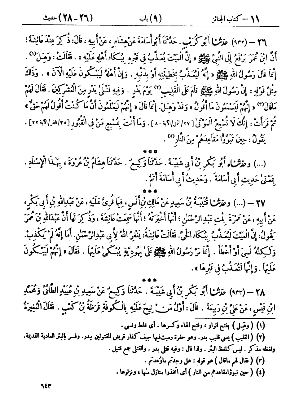 ٢٦ - (٩٣٢) حَدَّثَنَا أَبُو كُرَيْبٍ، حَدَّثَنَا أَبُو أُسَامَةَ، عَنْ هِشَامٍ، عَنْ أَبِيهِ، قَالَ: ذُكِرَ عِنْدَ عَائِشَةَ، أَنَّ ابْنَ عُمَرَ يَرْفَعُ إِلَى النَّبِيِّ صَلَّى اللهُ عَلَيْهِ وَسَلَّمَ «إِنَّ الْمَيِّتَ يُعَذَّبُ فِي قَبْرِهِ بِبُكَاءِ أَهْلِهِ عَلَيْهِ» فَقَالَتْ: وَهِلَ، إِنَّمَا قَالَ رَسُولُ اللهِ صَلَّى اللهُ عَلَيْهِ وَسَلَّمَ: «إِنَّهُ لَيُعَذَّبُ بِخَطِيئَتِهِ أَوْ بِذَنْبِهِ، وَإِنَّ أَهْلَهُ لَيَبْكُونَ عَلَيْهِ الْآنَ» وَذَاكَ مِثْلُ قَوْلِهِ: إِنَّ رَسُولَ اللهِ صَلَّى اللهُ عَلَيْهِ وَسَلَّمَ قَامَ عَلَى الْقَلِيبِ يَوْمَ بَدْرٍ، وَفِيهِ قَتْلَى بَدْرٍ مِنَ الْمُشْرِكِينَ، فَقَالَ لَهُمْ مَا قَالَ «إِنَّهُمْ لَيَسْمَعُونَ مَا أَقُولُ» وَقَدْ وَهِلَ، إِنَّمَا قَالَ: «إِنَّهُمْ لَيَعْلَمُونَ أَنَّ مَا كُنْتُ أَقُولُ لَهُمْ حَقٌّ» ثُمَّ قَرَأَتْ: {إِنَّكَ لَا تُسْمِعُ الْمَوْتَى} [النمل: ٨٠] {وَمَا أَنْتَ بِمُسْمِعٍ مَنْ فِي الْقُبُورِ} [فاطر: ٢٢] يَقُولُ: حِينَ تَبَوَّءُوا مَقَاعِدَهُمْ مِنَ النَّارِ.