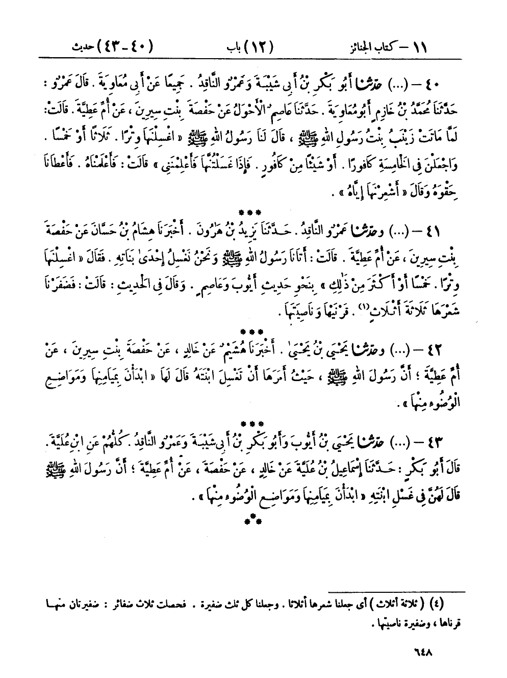٤٣ - (٩٣٩) حَدَّثَنَا يَحْيَى بْنُ أَيُّوبَ، وَأَبُو بَكْرِ بْنُ أَبِي شَيْبَةَ، وَعَمْرٌو النَّاقِدُ، كُلُّهُمْ عَنِ ابْنِ عُلَيَّةَ، قَالَ أَبُو بَكْرٍ: حَدَّثَنَا إِسْمَاعِيلُ ابْنُ عُلَيَّةَ، عَنْ خَالِدٍ، عَنْ حَفْصَةَ، عَنْ أُمِّ عَطِيَّةَ، أَنَّ رَسُولَ اللهِ صَلَّى اللهُ عَلَيْهِ وَسَلَّمَ قَالَ لَهُنَّ فِي غَسْلِ ابْنَتِهِ: «ابْدَأْنَ بِمَيَامِنِهَا، وَمَوَاضِعِ الْوُضُوءِ مِنْهَا»