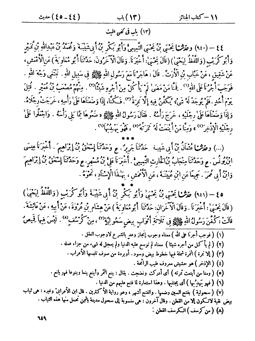 ٤٤ - (٩٤٠) وحَدَّثَنَا يَحْيَى بْنُ يَحْيَى التَّمِيمِيُّ، وَأَبُو بَكْرِ بْنُ أَبِي شَيْبَةَ، وَمُحَمَّدُ بْنُ عَبْدِ اللهِ بْنِ نُمَيْرٍ، وَأَبُو كُرَيْبٍ - وَاللَّفْظُ لِيَحْيَى -، قَالَ يَحْيَى: أَخْبَرَنَا، وَقَالَ الْآخَرُونَ: حَدَّثَنَا أَبُو مُعَاوِيَةَ، عَنِ الْأَعْمَشِ، عَنْ شَقِيقٍ، عَنْ خَبَّابِ بْنِ الْأَرَتِّ، قَالَ: هَاجَرْنَا مَعَ رَسُولِ اللهِ صَلَّى اللهُ عَلَيْهِ وَسَلَّمَ فِي سَبِيلِ اللهِ، نَبْتَغِي وَجْهَ اللهِ، فَوَجَبَ أَجْرُنَا عَلَى اللهِ، فَمِنَّا مَنْ مَضَى لَمْ يَأْكُلْ مِنْ أَجْرِهِ شَيْئًا، مِنْهُمْ مُصْعَبُ بْنُ عُمَيْرٍ، قُتِلَ يَوْمَ أُحُدٍ، فَلَمْ يُوجَدْ لَهُ شَيْءٌ يُكَفَّنُ فِيهِ إِلَّا نَمِرَةٌ، فَكُنَّا إِذَا وَضَعْنَاهَا عَلَى رَأْسِهِ، خَرَجَتْ رِجْلَاهُ، وَإِذَا وَضَعْنَاهَا عَلَى رِجْلَيْهِ، خَرَجَ رَأْسُهُ، فَقَالَ رَسُولُ اللهِ صَلَّى اللهُ عَلَيْهِ وَسَلَّمَ: «ضَعُوهَا مِمَّا يَلِي رَأْسَهُ، وَاجْعَلُوا عَلَى رِجْلَيْهِ الْإِذْخِرَ»، وَمِنَّا مَنْ أَيْنَعَتْ لَهُ ثَمَرَتُهُ، فَهْوَ يَهْدِبُهَا