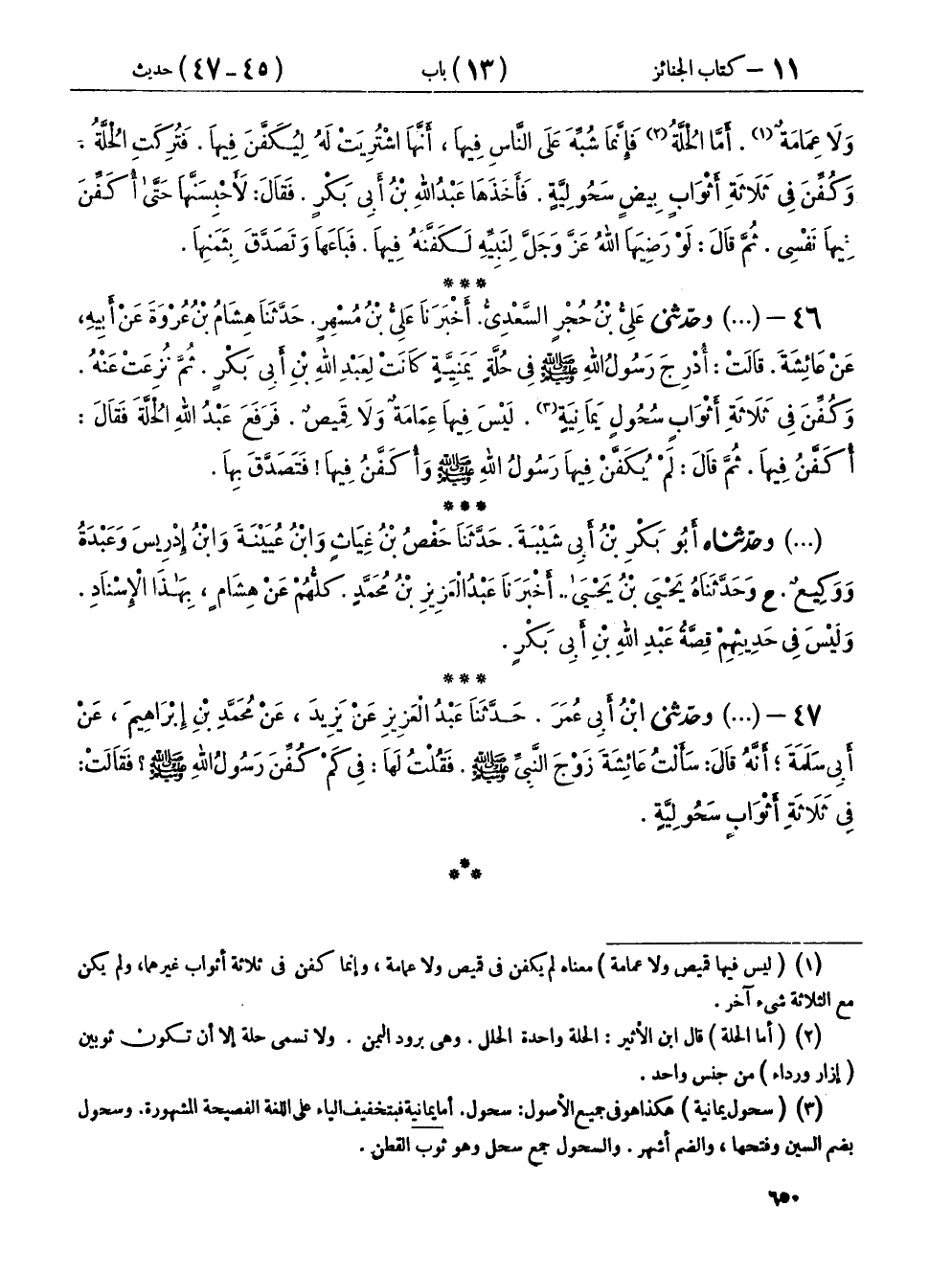 ٤٦ - (٩٤١) وحَدَّثَنِي عَلِيُّ بْنُ حُجْرٍ السَّعْدِيُّ، أَخْبَرَنَا عَلِيُّ بْنُ مُسْهِرٍ، حَدَّثَنَا هِشَامُ بْنُ عُرْوَةَ، عَنْ أَبِيهِ، عَنْ عَائِشَةَ، قَالَتْ: «أُدْرِجَ رَسُولُ اللهِ صَلَّى اللهُ عَلَيْهِ وَسَلَّمَ فِي حُلَّةٍ يَمَنِيَّةٍ كَانَتْ لِعَبْدِ اللهِ بْنِ أَبِي بَكْرٍ، ثُمَّ نُزِعَتْ عَنْهُ، وَكُفِّنَ فِي ثَلَاثَةِ أَثْوَابٍ سُحُولٍ يَمَانِيَةٍ، لَيْسَ فِيهَا عِمَامَةٌ، وَلَا قَمِيصٌ»، فَرَفَعَ عَبْدُ اللهِ الْحُلَّةَ، فَقَالَ: أُكَفَّنُ فِيهَا، ثُمَّ قَالَ: لَمْ يُكَفَّنْ فِيهَا رَسُولُ اللهِ صَلَّى اللهُ عَلَيْهِ وَسَلَّمَ، وَأُكَفَّنُ فِيهَا، فَتَصَدَّقَ بِهَا