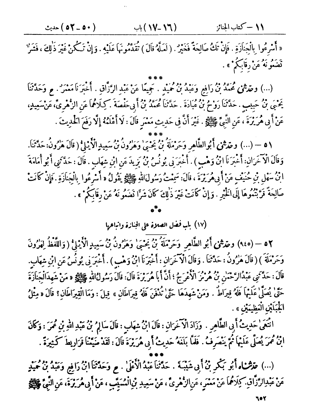 ٥١ - (٩٤٤) وحَدَّثَنِي أَبُو الطَّاهِرِ، وَحَرْمَلَةُ بْنُ يَحْيَى، وَهَارُونُ بْنُ سَعِيدٍ الْأَيْلِيُّ، قَالَ هَارُونُ: حَدَّثَنَا، وقَالَ الْآخَرَانِ: أَخْبَرَنَا ابْنُ وَهْبٍ، أَخْبَرَنِي يُونُسُ بْنُ يَزِيدَ، عَنِ ابْنِ شِهَابٍ، قَالَ: حَدَّثَنِي أَبُو أُمَامَةَ بْنُ سَهْلِ بْنِ حُنَيْفٍ، عَنْ أَبِي هُرَيْرَةَ، قَالَ: سَمِعْتُ رَسُولَ اللهِ صَلَّى اللهُ عَلَيْهِ وَسَلَّمَ يَقُولُ: «أَسْرِعُوا بِالْجَنَازَةِ، فَإِنْ كَانَتْ صَالِحَةً قَرَّبْتُمُوهَا إِلَى الْخَيْرِ، وَإِنْ كَانَتْ غَيْرَ ذَلِكَ كَانَ شَرًّا تَضَعُونَهُ عَنْ رِقَابِكُمْ»