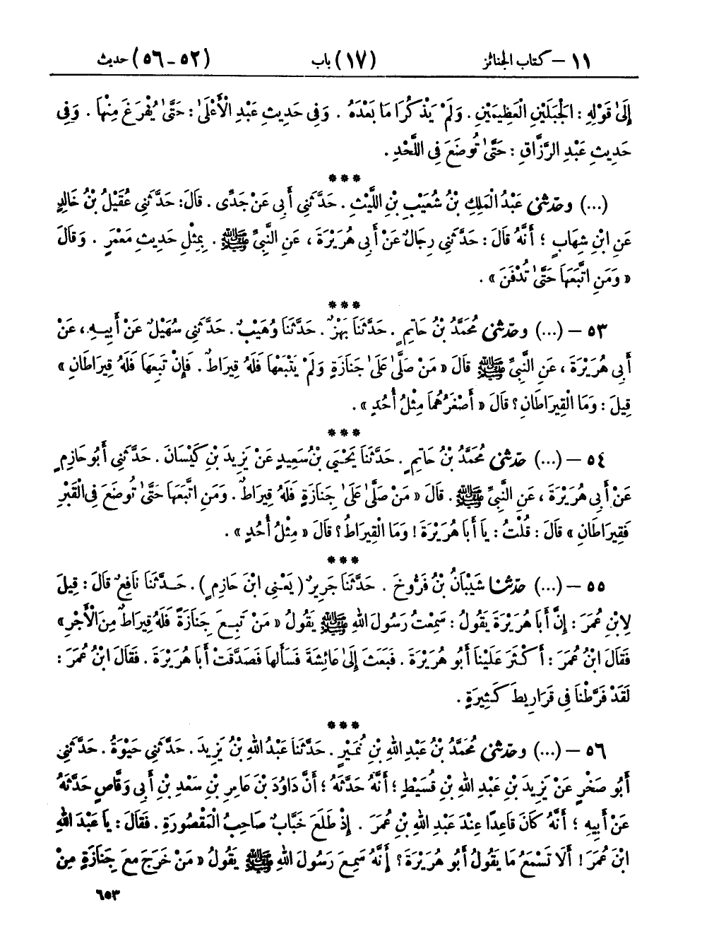 ٥٥ - (٩٤٥) حَدَّثَنَا شَيْبَانُ بْنُ فَرُّوخَ، حَدَّثَنَا جَرِيرٌ يَعْنِي ابْنَ حَازِمٍ، حَدَّثَنَا نَافِعٌ، قَالَ: قِيلَ لِابْنِ عُمَرَ: إِنَّ أَبَا هُرَيْرَةَ يَقُولُ: سَمِعْتُ رَسُولَ اللهِ صَلَّى اللهُ عَلَيْهِ وَسَلَّمَ يَقُولُ: «مَنْ تَبِعَ جَنَازَةً فَلَهُ قِيرَاطٌ مِنَ الْأَجْرِ» فَقَالَ ابْنُ عُمَرَ: أَكْثَرَ عَلَيْنَا أَبُو هُرَيْرَةَ، فَبَعَثَ إِلَى عَائِشَةَ، فَسَأَلَهَا، فَصَدَّقَتْ أَبَا هُرَيْرَةَ فَقَالَ ابْنُ عُمَرَ: «لَقَدْ فَرَّطْنَا فِي قَرَارِيطَ كَثِيرَةٍ»