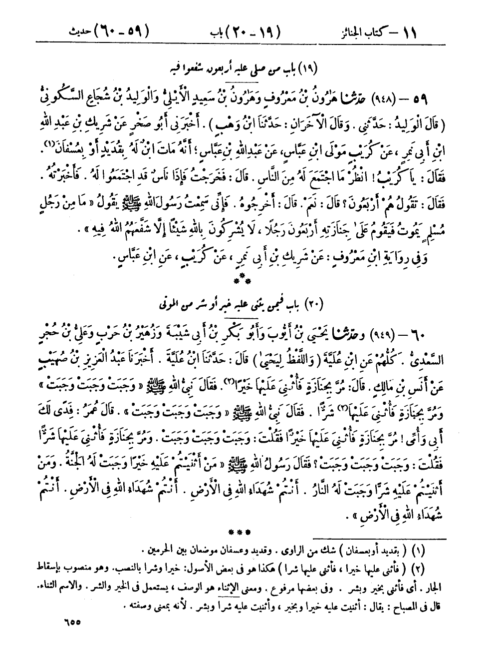 ٥٩ - (٩٤٨) حَدَّثَنَا هَارُونُ بْنُ مَعْرُوفٍ، وَهَارُونُ بْنُ سَعِيدٍ الْأَيْلِيُّ، وَالْوَلِيدُ بْنُ شُجَاعٍ السَّكُونِيُّ، قَالَ الْوَلِيدُ: حَدَّثَنِي، وقَالَ الْآخَرَانِ: حَدَّثَنَا ابْنُ وَهْبٍ، أَخْبَرَنِي أَبُو صَخْرٍ، عَنْ شَرِيكِ بْنِ عَبْدِ اللهِ بْنِ أَبِي نَمِرٍ، عَنْ كُرَيْبٍ، مَوْلَى ابْنِ عَبَّاسٍ، عَنْ عَبْدِ اللهِ بْنِ عَبَّاسٍ، أَنَّهُ مَاتَ ابْنٌ لَهُ بِقُدَيْدٍ - أَوْ بِعُسْفَانَ - فَقَالَ: يَا كُرَيْبُ، انْظُرْ مَا اجْتَمَعَ لَهُ مِنَ النَّاسِ، قَالَ: فَخَرَجْتُ، فَإِذَا نَاسٌ قَدِ اجْتَمَعُوا لَهُ، فَأَخْبَرْتُهُ، فَقَالَ: تَقُولُ هُمْ أَرْبَعُونَ؟ قَالَ: نَعَمْ، قَالَ: أَخْرِجُوهُ، فَإِنِّي سَمِعْتُ رَسُولَ اللهِ صَلَّى اللهُ عَلَيْهِ وَسَلَّمَ، يَقُولُ: «مَا مِنْ رَجُلٍ مُسْلِمٍ يَمُوتُ، فَيَقُومُ عَلَى جَنَازَتِهِ أَرْبَعُونَ رَجُلًا، لَا يُشْرِكُونَ بِاللهِ شَيْئًا، إِلَّا شَفَّعَهُمُ اللهُ فِيهِ»، وَفِي رِوَايَةِ ابْنِ مَعْرُوفٍ: عَنْ شَرِيكِ بْنِ أَبِي نَمِرٍ، عَنْ كُرَيْبٍ، عَنِ ابْنِ عَبَّاسٍ