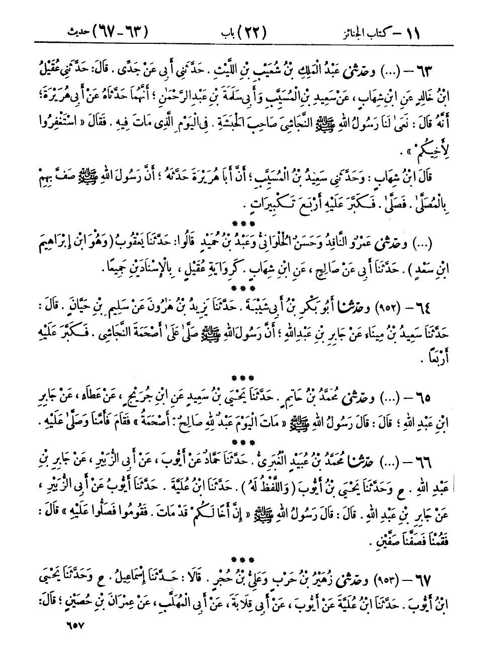 ٦٧ - (٩٥٣) وحَدَّثَنِي زُهَيْرُ بْنُ حَرْبٍ، وَعَلِيُّ بْنُ حُجْرٍ، قَالَا: حَدَّثَنَا إِسْمَاعِيلُ، ح وحَدَّثَنَا يَحْيَى بْنُ أَيُّوبَ، حَدَّثَنَا ابْنُ عُلَيَّةَ، عَنْ أَيُّوبَ، عَنْ أَبِي قِلَابَةَ، عَنْ أَبِي الْمُهَلَّبِ، عَنْ عِمْرَانَ بْنِ حُصَيْنٍ، قَالَ: قَالَ رَسُولُ اللهِ: «إِنَّ أَخًا لَكُمْ قَدْ مَاتَ، فَقُومُوا فَصَلُّوا عَلَيْهِ» يَعْنِي النَّجَاشِيَ، وَفِي رِوَايَةِ زُهَيْرٍ: «إِنَّ أَخَاكُمْ»