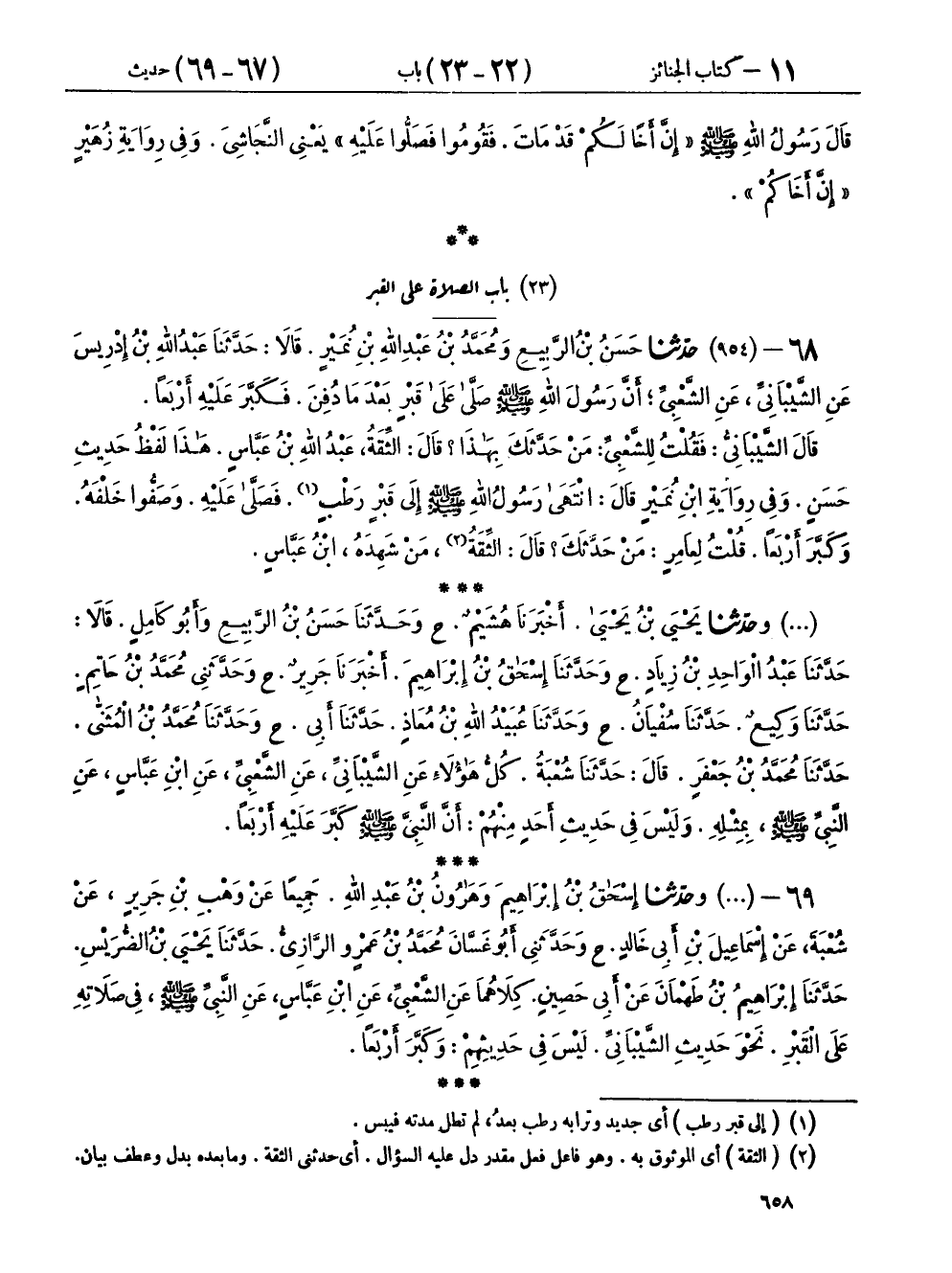 ٦٨ - (٩٥٤) حَدَّثَنَا حَسَنُ بْنُ الرَّبِيعِ، وَمُحَمَّدُ بْنُ عَبْدِ اللهِ بْنِ نُمَيْرٍ، قَالَا: حَدَّثَنَا عَبْدُ اللهِ بْنُ إِدْرِيسَ، عَنِ الشَّيْبَانِيِّ، عَنِ الشَّعْبِيِّ، «أَنَّ رَسُولَ اللهِ صَلَّى اللهُ عَلَيْهِ وَسَلَّمَ صَلَّى عَلَى قَبْرٍ بَعْدَمَا دُفِنَ، فَكَبَّرَ عَلَيْهِ أَرْبَعًا»، قَالَ الشَّيْبَانِيُّ: فَقُلْتُ لِلشَّعْبِيِّ: مَنْ حَدَّثَكَ بِهَذَا؟ قَالَ: الثِّقَةُ عَبْدُ اللهِ بْنُ عَبَّاسٍ، هَذَا لَفْظُ حَدِيثِ حَسَنٍ، وَفِي رِوَايَةِ ابْنِ نُمَيْرٍ قَالَ: انْتَهَى رَسُولُ اللهِ صَلَّى اللهُ عَلَيْهِ وَسَلَّمَ إِلَى قَبْرٍ رَطْبٍ، فَصَلَّى عَلَيْهِ، وَصَفُّوا خَلْفَهُ، وَكَبَّرَ أَرْبَعًا، قُلْتُ لِعَامِرٍ: مَنْ حَدَّثَكَ؟ قَالَ الثِّقَةُ مَنْ شَهِدَهُ ابْنُ عَبَّاسٍ.