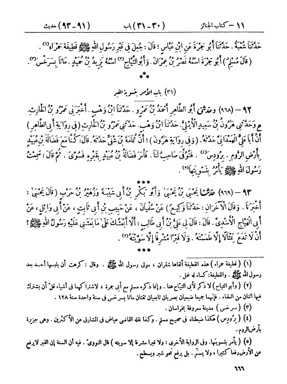 ٩٢ - (٩٦٨) وحَدَّثَنِي أَبُو الطَّاهِرِ أَحْمَدُ بْنُ عَمْرٍو، حَدَّثَنَا ابْنُ وَهْبٍ، أَخْبَرَنِي عَمْرُو بْنُ الْحَارِثِ، ح وحَدَّثَنِي هَارُونُ بْنُ سَعِيدٍ الْأَيْلِيُّ، حَدَّثَنَا ابْنُ وَهْبٍ، حَدَّثَنِي عَمْرُو بْنُ الْحَارِثِ - فِي رِوَايَةِ أَبِي الطَّاهِرِ - أَنَّ أَبَا عَلِيٍّ الْهَمْدَانِيَّ، حَدَّثَهُ - وَفِي رِوَايَةِ هَارُونَ - أَنَّ ثُمَامَةَ بْنَ شُفَيٍّ، حَدَّثَهُ قَالَ: كُنَّا مَعَ فَضَالَةَ بْنِ عُبَيْدٍ بِأَرْضِ الرُّومِ بِرُودِسَ، فَتُوُفِّيَ صَاحِبٌ لَنَا، فَأَمَرَ فَضَالَةُ بْنُ عُبَيْدٍ بِقَبْرِهِ فَسُوِّيَ، ثُمَّ قَالَ سَمِعْتُ رَسُولَ اللهِ صَلَّى اللهُ عَلَيْهِ وَسَلَّمَ: «يَأْمُرُ بِتَسْوِيَتِهَا»