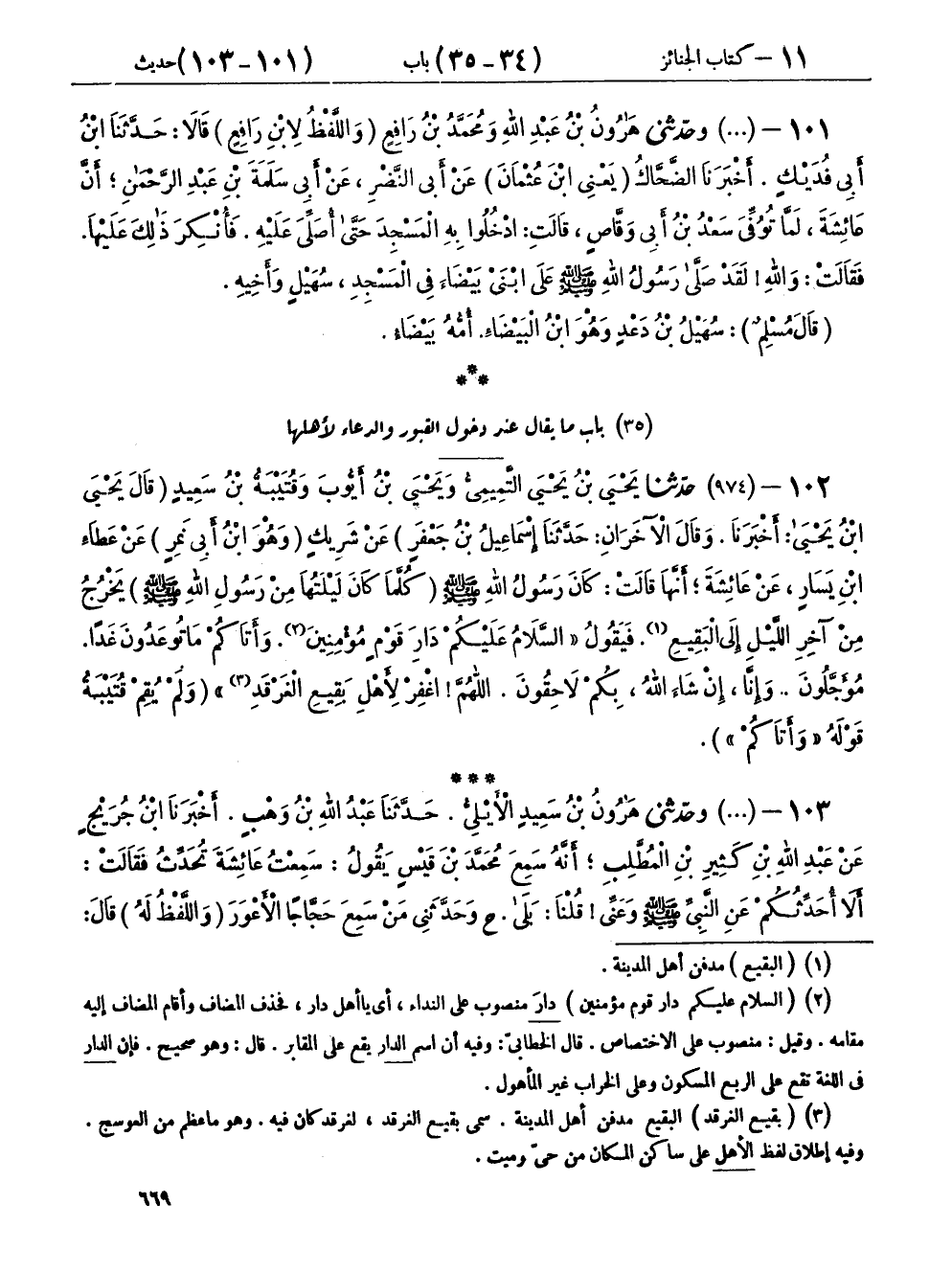 ١٠٢ - (٩٧٤) حَدَّثَنَا يَحْيَى بْنُ يَحْيَى التَّمِيمِيُّ، وَيَحْيَى بْنُ أَيُّوبَ، وَقُتَيْبَةُ بْنُ سَعِيدٍ - قَالَ يَحْيَى بْنُ يَحْيَى: أَخْبَرَنَا، وقَالَ الْآخَرَانِ: - حَدَّثَنَا إِسْمَاعِيلُ بْنُ جَعْفَرٍ، عَنْ شَرِيكٍ وَهُوَ ابْنُ أَبِي نَمِرٍ، عَنْ عَطَاءِ بْنِ يَسَارٍ، عَنْ عَائِشَةَ، أَنَّهَا قَالَتْ: كَانَ رَسُولُ اللهِ صَلَّى اللهُ عَلَيْهِ وَسَلَّمَ - كُلَّمَا كَانَ لَيْلَتُهَا مِنْ رَسُولِ اللهِ صَلَّى اللهُ عَلَيْهِ وَسَلَّمَ - يَخْرُجُ مِنْ آخِرِ اللَّيْلِ إِلَى الْبَقِيعِ، فَيَقُولُ: «السَّلَامُ عَلَيْكُمْ دَارَ قَوْمٍ مُؤْمِنِينَ، وَأَتَاكُمْ مَا تُوعَدُونَ غَدًا، مُؤَجَّلُونَ، وَإِنَّا، إِنْ شَاءَ اللهُ، بِكُمْ لَاحِقُونَ، اللهُمَّ، اغْفِرْ لِأَهْلِ بَقِيعِ الْغَرْقَدِ» وَلَمْ يُقِمْ قُتَيْبَةُ قَوْلَهُ «وَأَتَاكُمْ»