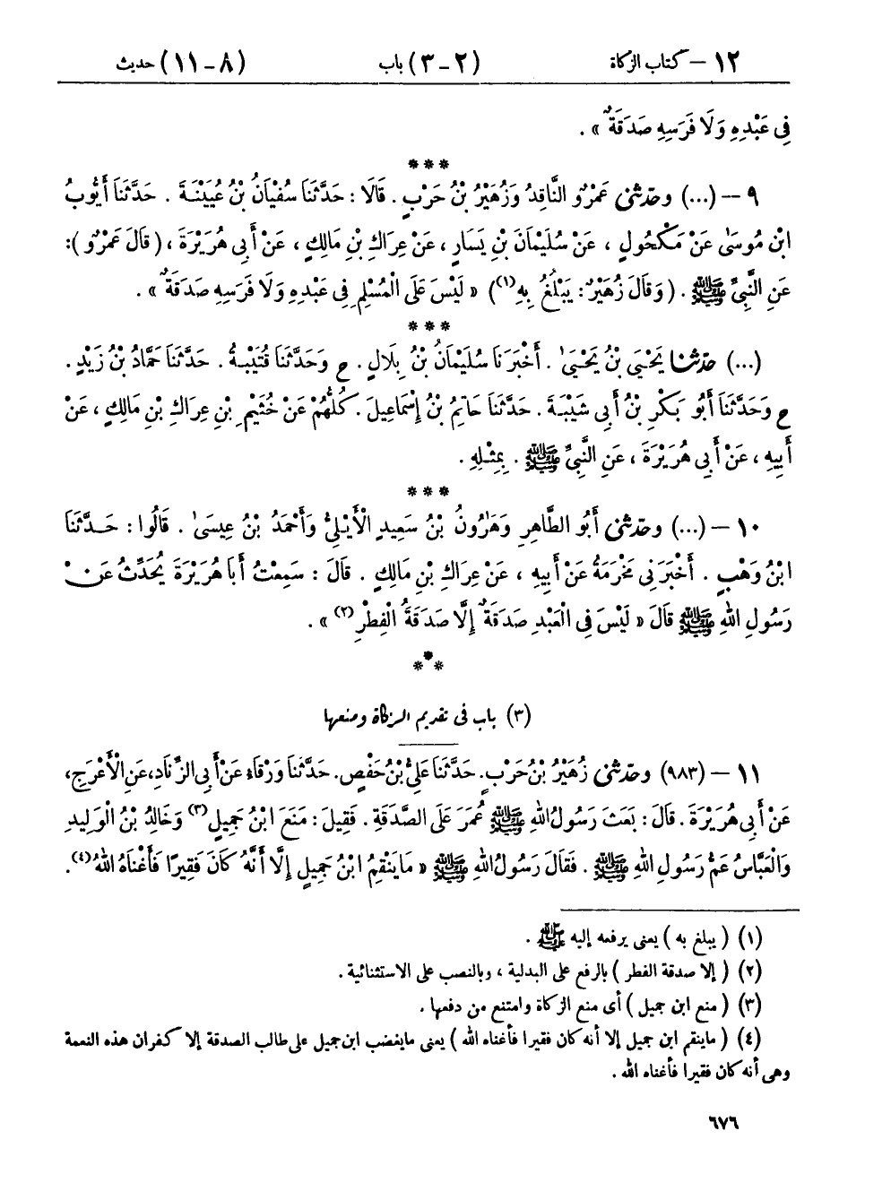 ١١ - (٩٨٣) وحَدَّثَنِي زُهَيْرُ بْنُ حَرْبٍ، حَدَّثَنَا عَلِيُّ بْنُ حَفْصٍ، حَدَّثَنَا وَرْقَاءُ، عَنْ أَبِي الزِّنَادِ، عَنِ الْأَعْرَجِ، عَنْ أَبِي هُرَيْرَةَ، قَالَ: بَعَثَ رَسُولُ اللهِ صَلَّى اللهُ عَلَيْهِ وَسَلَّمَ عُمَرَ عَلَى الصَّدَقَةِ، فَقِيلَ: مَنَعَ ابْنُ جَمِيلٍ، وَخَالِدُ بْنُ الْوَلِيدِ، وَالْعَبَّاسُ عَمُّ رَسُولِ اللهِ صَلَّى اللهُ عَلَيْهِ وَسَلَّمَ، فَقَالَ رَسُولُ اللهِ صَلَّى اللهُ عَلَيْهِ وَسَلَّمَ «مَا يَنْقِمُ ابْنُ جَمِيلٍ إِلَّا أَنَّهُ كَانَ فَقِيرًا فَأَغْنَاهُ اللهُ، وَأَمَّا خَالِدٌ فَإِنَّكُمْ تَظْلِمُونَ خَالِدًا، قَدِ احْتَبَسَ أَدْرَاعَهُ وَأَعْتَادَهُ فِي سَبِيلِ اللهِ، وَأَمَّا الْعَبَّاسُ فَهِيَ عَلَيَّ، وَمِثْلُهَا مَعَهَا» ثُمَّ قَالَ: «يَا عُمَرُ، أَمَا شَعَرْتَ أَنَّ عَمَّ الرَّجُلِ صِنْوُ أَبِيهِ؟»
