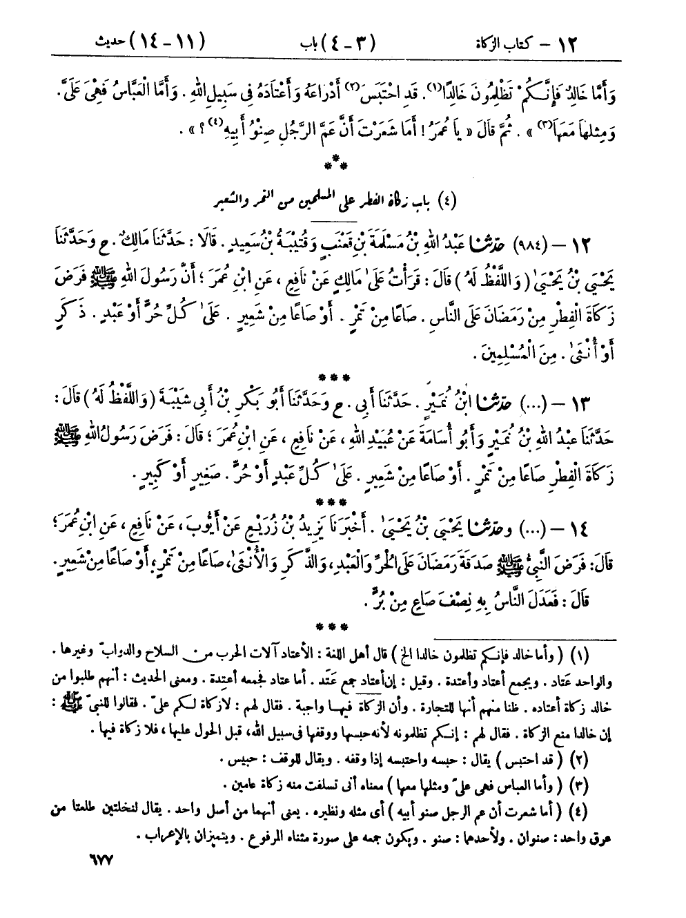 ١٢ - (٩٨٤) حَدَّثَنَا عَبْدُ اللهِ بْنُ مَسْلَمَةَ بْنِ قَعْنَبٍ، وَقُتَيْبَةُ بْنُ سَعِيدٍ، قَالَا: حَدَّثَنَا مَالِكٌ، ح وَحَدَّثَنَا يَحْيَى بْنُ يَحْيَى، - وَاللَّفْظُ لَهُ - قَالَ: قَرَأْتُ عَلَى مَالِكٍ، عَنْ نَافِعٍ، عَنِ ابْنِ عُمَرَ: «أَنَّ رَسُولَ اللهِ صَلَّى اللهُ عَلَيْهِ وَسَلَّمَ فَرَضَ زَكَاةَ الْفِطْرِ مِنْ رَمَضَانَ عَلَى النَّاسِ، صَاعًا مِنْ تَمْرٍ، أَوْ صَاعًا مِنْ شَعِيرٍ، عَلَى كُلِّ حُرٍّ أَوْ عَبْدٍ، ذَكَرٍ أَوْ أُنْثَى، مِنَ الْمُسْلِمِينَ»