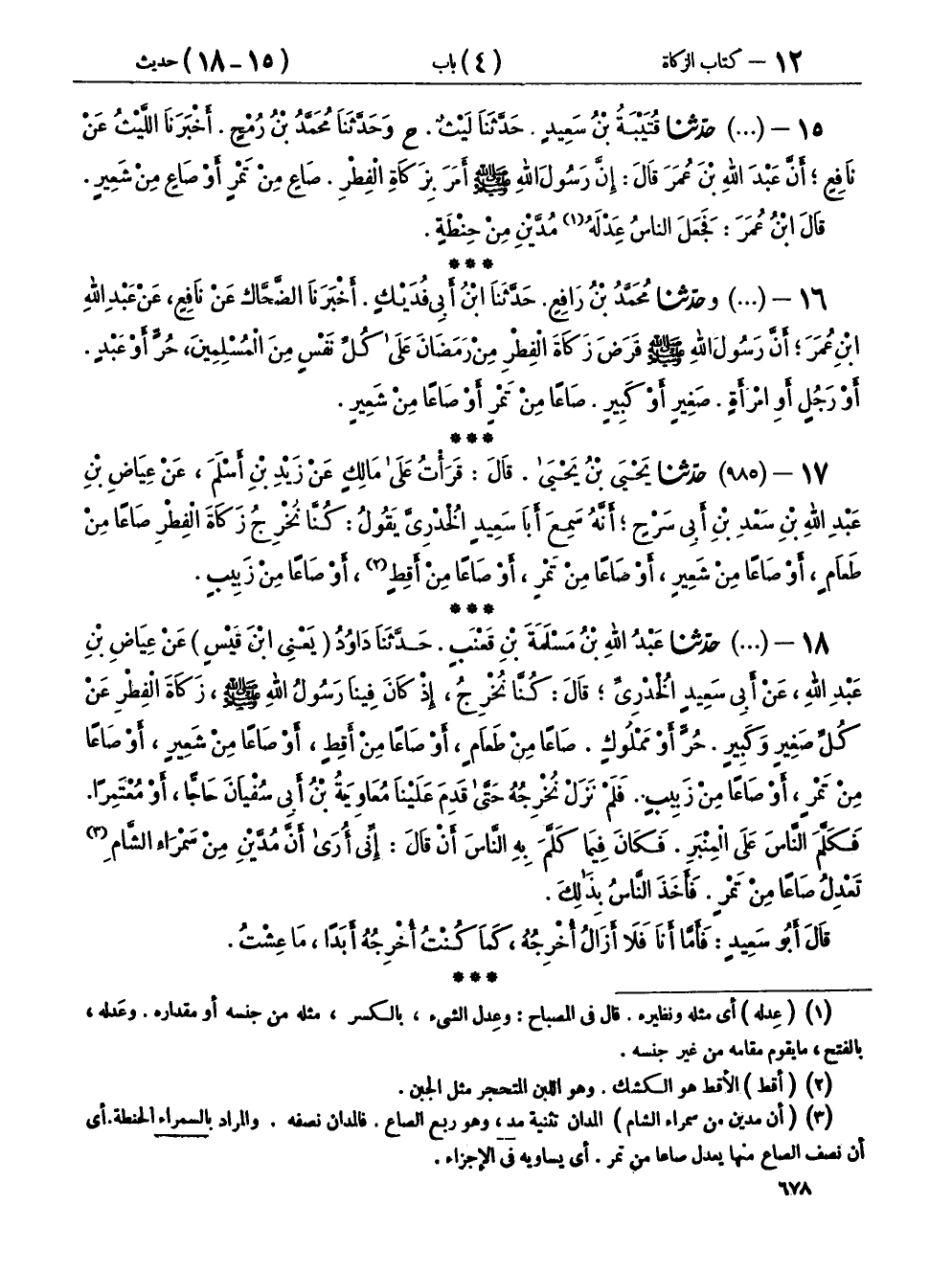 ١٨ - (٩٨٥) حَدَّثَنَا عَبْدُ اللهِ بْنُ مَسْلَمَةَ بْنِ قَعْنَبٍ، حَدَّثَنَا دَاوُدُ يَعْنِي ابْنَ قَيْسٍ، عَنْ عِيَاضِ بْنِ عَبْدِ اللهِ، عَنْ أَبِي سَعِيدٍ الْخُدْرِيِّ، قَالَ: «كُنَّا نُخْرِجُ إِذْ كَانَ فِينَا رَسُولُ اللهِ صَلَّى اللهُ عَلَيْهِ وَسَلَّمَ زَكَاةَ الْفِطْرِ، عَنْ كُلِّ صَغِيرٍ، وَكَبِيرٍ، حُرٍّ أَوْ مَمْلُوكٍ، صَاعًا مِنْ طَعَامٍ، أَوْ صَاعًا مِنْ أَقِطٍ، أَوْ صَاعًا مِنْ شَعِيرٍ، أَوْ صَاعًا مِنْ تَمْرٍ، أَوْ صَاعًا مِنْ زَبِيبٍ» فَلَمْ نَزَلْ نُخْرِجُهُ حَتَّى قَدِمَ عَلَيْنَا مُعَاوِيَةُ بْنُ أَبِي سُفْيَانَ حَاجًّا، أَوْ مُعْتَمِرًا فَكَلَّمَ النَّاسَ عَلَى الْمِنْبَرِ، فَكَانَ فِيمَا كَلَّمَ بِهِ النَّاسَ أَنْ قَالَ: «إِنِّي أَرَى أَنَّ مُدَّيْنِ مِنْ سَمْرَاءِ الشَّامِ، تَعْدِلُ صَاعًا مِنْ تَمْرٍ» فَأَخَذَ النَّاسُ بِذَلِكَ قَالَ أَبُو سَعِيدٍ: «فَأَمَّا أَنَا فَلَا أَزَالُ أُخْرِجُهُ كَمَا كُنْتُ أُخْرِجُهُ، أَبَدًا مَا عِشْتُ»