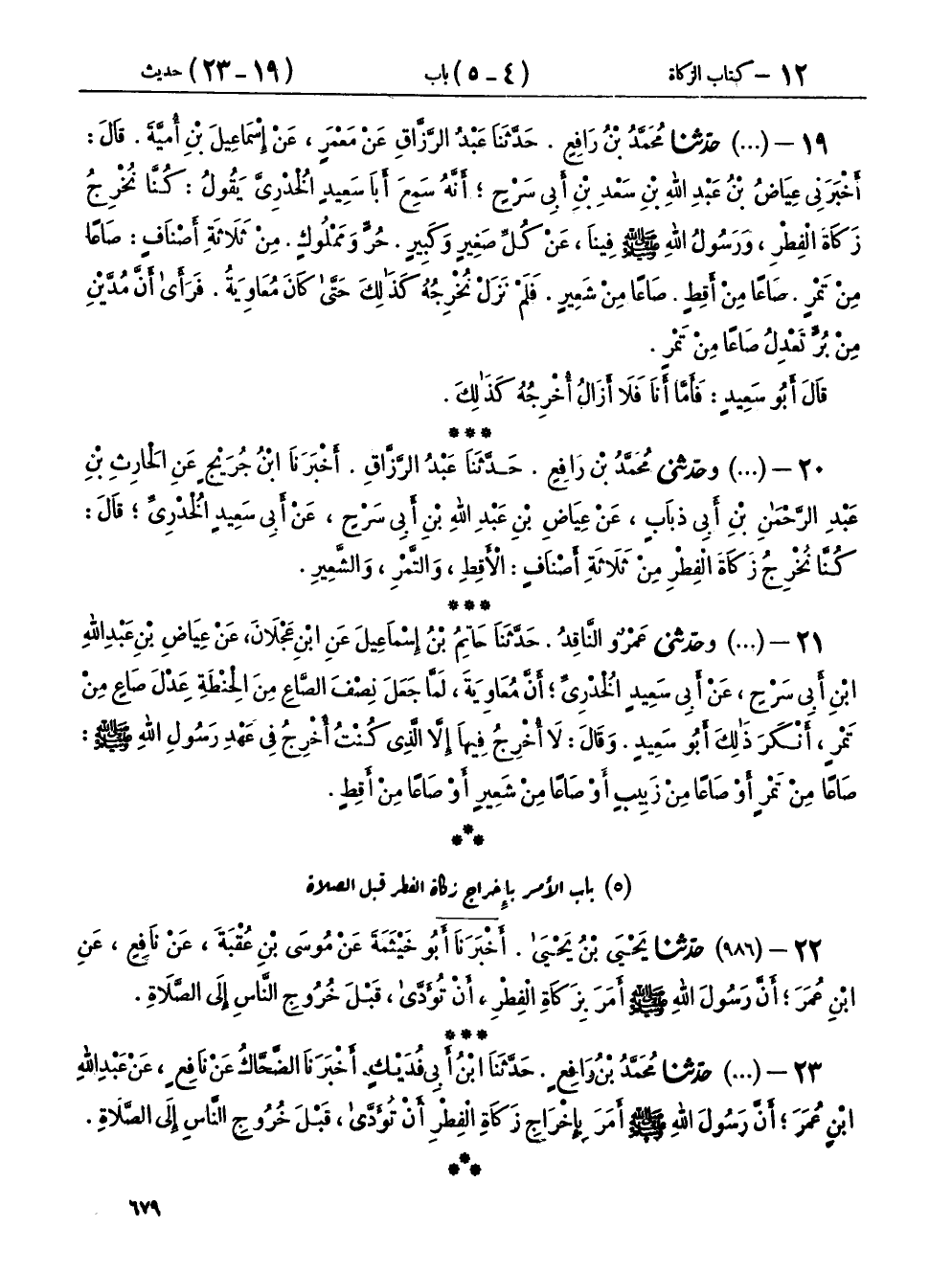 ٢٣ - (٩٨٦) حَدَّثَنَا مُحَمَّدُ بْنُ رَافِعٍ، حَدَّثَنَا ابْنُ أَبِي فُدَيْكٍ، أَخْبَرَنَا الضَّحَّاكُ، عَنْ نَافِعٍ، عَنْ عَبْدِ اللهِ بْنِ عُمَرَ: «أَنَّ رَسُولَ اللهِ صَلَّى اللهُ عَلَيْهِ وَسَلَّمَ أَمَرَ بِإِخْرَاجِ زَكَاةِ الْفِطْرِ، أَنْ تُؤَدَّى قَبْلَ خُرُوجِ النَّاسِ إِلَى الصَّلَاةِ»