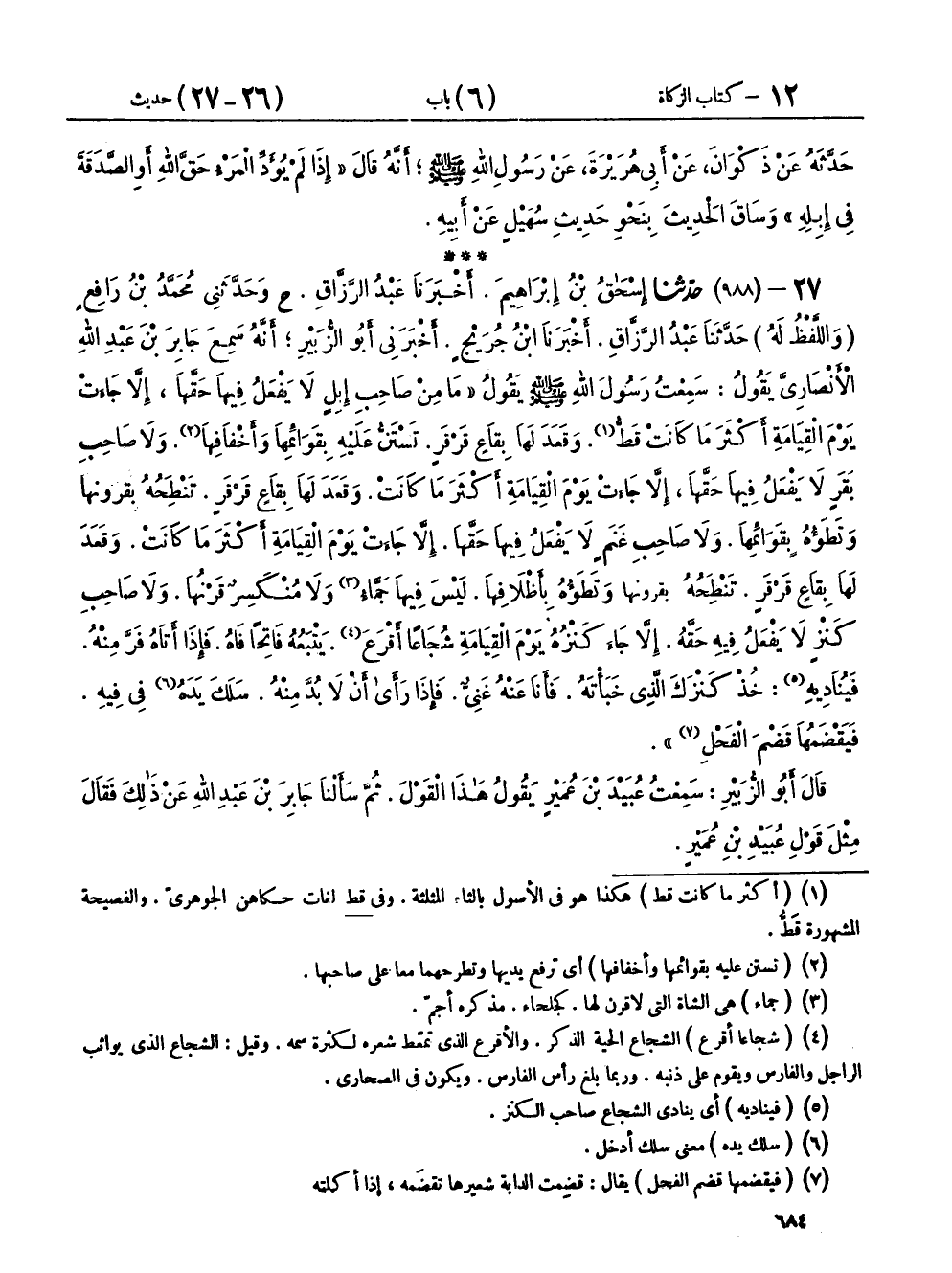 ٢٧ - (٩٨٨) حَدَّثَنَا إِسْحَاقُ بْنُ إِبْرَاهِيمَ، أَخْبَرَنَا عَبْدُ الرَّزَّاقِ، ح وحَدَّثَنِي مُحَمَّدُ بْنُ رَافِعٍ، - وَاللَّفْظُ لَهُ - حَدَّثَنَا عَبْدُ الرَّزَّاقِ، أَخْبَرَنَا ابْنُ جُرَيْجٍ، أَخْبَرَنِي أَبُو الزُّبَيْرِ، أَنَّهُ سَمِعَ جَابِرَ بْنَ عَبْدِ اللهِ الْأَنْصَارِيَّ، يَقُولُ: سَمِعْتُ رَسُولَ اللهِ صَلَّى اللهُ عَلَيْهِ وَسَلَّمَ يَقُولُ: " مَا مِنْ صَاحِبِ إِبِلٍ، لَا يَفْعَلُ فِيهَا حَقَّهَا، إِلَّا جَاءَتْ يَوْمَ الْقِيَامَةِ أَكْثَرَ مَا كَانَتْ قَطُّ، وَقَعَدَ لَهَا بِقَاعٍ قَرْقَرٍ تَسْتَنُّ عَلَيْهِ بِقَوَائِمِهَا، وَأَخْفَافِهَا، وَلَا صَاحِبِ بَقَرٍ، لَا يَفْعَلُ فِيهَا حَقَّهَا، إِلَّا جَاءَتْ يَوْمَ الْقِيَامَةِ أَكْثَرَ مَا كَانَتْ، وَقَعَدَ لَهَا بِقَاعٍ قَرْقَرٍ تَنْطَحُهُ بِقُرُونِهَا، وَتَطَؤُهُ بِقَوَائِمِهَا، وَلَا صَاحِبِ غَنَمٍ، لَا يَفْعَلُ فِيهَا حَقَّهَا، إِلَّا جَاءَتْ يَوْمَ الْقِيَامَةِ أَكْثَرَ مَا كَانَتْ، وَقَعَدَ لَهَا بِقَاعٍ قَرْقَرٍ تَنْطَحُهُ بِقُرُونِهَا وَتَطَؤُهُ بِأَظْلَافِهَا، لَيْسَ فِيهَا جَمَّاءُ وَلَا مُنْكَسِرٌ قَرْنُهَا، وَلَا صَاحِبِ كَنْزٍ لَا يَفْعَلُ فِيهِ حَقَّهُ، إِلَّا جَاءَ كَنْزُهُ يَوْمَ الْقِيَامَةِ شُجَاعًا أَقْرَعَ، يَتْبَعُهُ فَاتِحًا فَاهُ، فَإِذَا أَتَاهُ فَرَّ مِنْهُ، فَيُنَادِيهِ: خُذْ كَنْزَكَ الَّذِي خَبَأْتَهُ، فَأَنَا عَنْهُ غَنِيٌّ، فَإِذَا رَأَى أَنْ لَا بُدَّ مِنْهُ، سَلَكَ يَدَهُ فِي فِيهِ، فَيَقْضَمُهَا قَضْمَ الْفَحْلِ " قَالَ أَبُو الزُّبَيْرِ: سَمِعْتُ عُبَيْدَ بْنَ عُمَيْرٍ يَقُولُ: هَذَا الْقَوْلَ: ثُمَّ سَأَلْنَا جَابِرَ بْنَ عَبْدِ اللهِ عَنْ ذَلِكَ فَقَالَ مِثْلَ قَوْلِ عُبَيْدِ بْنِ عُمَيْرٍ، وقَالَ أَبُو الزُّبَيْرِ: سَمِعْتُ عُبَيْدَ بْنَ عُمَيْرٍ، يَقُولُ: قَالَ رَجُلٌ: يَا رَسُولَ اللهِ، مَا حَقُّ الْإِبِلِ؟ قَالَ: «حَلَبُهَا عَلَى الْمَاءِ، وَإِعَارَةُ دَلْوِهَا، وَإِعَارَةُ فَحْلِهَا، وَمَنِيحَتُهَا وَحَمْلٌ عَلَيْهَا فِي سَبِيلِ اللهِ»