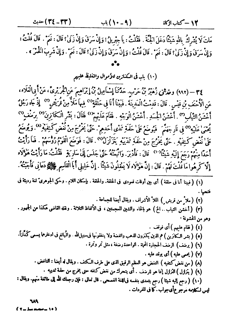 ٣٤ - (٩٩٢) وحَدَّثَنِي زُهَيْرُ بْنُ حَرْبٍ، حَدَّثَنَا إِسْمَاعِيلُ بْنُ إِبْرَاهِيمَ، عَنِ الْجُرَيْرِيِّ، عَنْ أَبِي الْعَلَاءِ، عَنِ الْأَحْنَفِ بْنِ قَيْسٍ، قَالَ: قَدِمْتُ الْمَدِينَةَ فَبَيْنَا أَنَا فِي حَلْقَةٍ فِيهَا مَلَأٌ مِنْ قُرَيْشٍ إِذْ جَاءَ رَجُلٌ أَخْشَنُ الثِّيَابِ، أَخْشَنُ الْجَسَدِ، أَخْشَنُ الْوَجْهِ، فَقَامَ عَلَيْهِمْ، فَقَالَ: بَشِّرِ الْكَانِزِينَ بِرَضْفٍ يُحْمَى عَلَيْهِ فِي نَارِ جَهَنَّمَ، فَيُوضَعُ عَلَى حَلَمَةِ ثَدْيِ أَحَدِهِمْ، حَتَّى يَخْرُجَ مِنْ نُغْضِ كَتِفَيْهِ، وَيُوضَعُ عَلَى نُغْضِ كَتِفَيْهِ، حَتَّى يَخْرُجَ مِنْ حَلَمَةِ ثَدْيَيْهِ يَتَزَلْزَلُ، قَالَ: فَوَضَعَ الْقَوْمُ رُءُوسَهُمْ، فَمَا رَأَيْتُ أَحَدًا مِنْهُمْ رَجَعَ إِلَيْهِ شَيْئًا، قَالَ: فَأَدْبَرَ، وَاتَّبَعْتُهُ حَتَّى جَلَسَ إِلَى سَارِيَةٍ، فَقُلْتُ: مَا رَأَيْتُ هَؤُلَاءِ إِلَّا كَرِهُوا مَا قُلْتَ لَهُمْ، قَالَ: إِنَّ هَؤُلَاءِ لَا يَعْقِلُونَ شَيْئًا، إِنَّ خَلِيلِي أَبَا الْقَاسِمِ صَلَّى اللهُ عَلَيْهِ وَسَلَّمَ دَعَانِي فَأَجَبْتُهُ، فَقَالَ: «أَتَرَى أُحُدًا؟» فَنَظَرْتُ مَا عَلَيَّ مِنَ الشَّمْسِ وَأَنَا أَظُنُّ أَنَّهُ يَبْعَثُنِي فِي حَاجَةٍ لَهُ، فَقُلْتُ: أَرَاهُ، فَقَالَ: «مَا يَسُرُّنِي أَنَّ لِي مِثْلَهُ ذَهَبًا أُنْفِقُهُ كُلَّهُ إِلَّا ثَلَاثَةَ دَنَانِيرَ» ثُمَّ هَؤُلَاءِ يَجْمَعُونَ الدُّنْيَا، لَا يَعْقِلُونَ شَيْئًا، قَالَ: قُلْتُ: مَا لَكَ وَلِإِخْوَتِكَ مِنْ قُرَيْشٍ، لَا تَعْتَرِيهِمْ وَتُصِيبُ مِنْهُمْ، قَالَ: لَا، وَرَبِّكَ، لَا أَسْأَلُهُمْ عَنْ دُنْيَا، وَلَا أَسْتَفْتِيهِمْ عَنْ دِينٍ، حَتَّى أَلْحَقَ بِاللهِ وَرَسُولِهِ