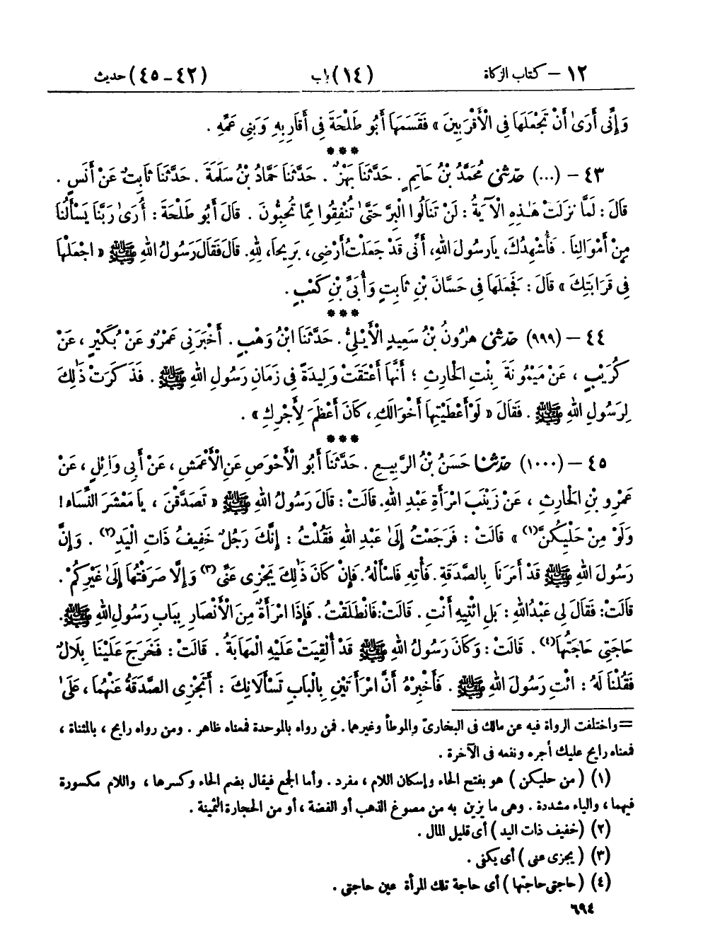 ٤٥ - (١٠٠٠) حَدَّثَنَا حَسَنُ بْنُ الرَّبِيعِ، حَدَّثَنَا أَبُو الْأَحْوَصِ، عَنِ الْأَعْمَشِ، عَنْ أَبِي وَائِلٍ، عَنْ عَمْرِو بْنِ الْحَارِثِ، عَنْ زَيْنَبَ، امْرَأَةِ عَبْدِ اللهِ قَالَتْ: قَالَ رَسُولُ اللهِ صَلَّى اللهُ عَلَيْهِ وَسَلَّمَ: «تَصَدَّقْنَ، يَا مَعْشَرَ النِّسَاءِ، وَلَوْ مِنْ حُلِيِّكُنَّ» قَالَتْ: فَرَجَعْتُ إِلَى عَبْدِ اللهِ فَقُلْتُ: إِنَّكَ رَجُلٌ خَفِيفُ ذَاتِ الْيَدِ، وَإِنَّ رَسُولَ اللهِ صَلَّى اللهُ عَلَيْهِ وَسَلَّمَ قَدْ أَمَرَنَا بِالصَّدَقَةِ، فَأْتِهِ فَاسْأَلْهُ، فَإِنْ كَانَ ذَلِكَ يَجْزِي عَنِّي وَإِلَّا صَرَفْتُهَا إِلَى غَيْرِكُمْ، قَالَتْ: فَقَالَ لِي عَبْدُ اللهِ: بَلِ ائْتِيهِ أَنْتِ، قَالَتْ: فَانْطَلَقْتُ، فَإِذَا امْرَأَةٌ مِنَ الْأَنْصَارِ بِبَابِ رَسُولِ اللهِ صَلَّى اللهُ عَلَيْهِ وَسَلَّمَ حَاجَتِي حَاجَتُهَا، قَالَتْ: وَكَانَ رَسُولُ اللهِ صَلَّى اللهُ عَلَيْهِ وَسَلَّمَ قَدْ أُلْقِيَتْ عَلَيْهِ الْمَهَابَةُ، قَالَتْ: فَخَرَجَ عَلَيْنَا بِلَالٌ فَقُلْنَا لَهُ: ائْتِ رَسُولَ اللهِ صَلَّى اللهُ عَلَيْهِ وَسَلَّمَ، فَأَخْبِرْهُ أَنَّ امْرَأَتَيْنِ بِالْبَابِ تَسْأَلَانِكَ: أَتُجْزِئُ الصَّدَقَةُ عَنْهُمَا، عَلَى أَزْوَاجِهِمَا، وَعَلَى أَيْتَامٍ فِي حُجُورِهِمَا؟ وَلَا تُخْبِرْهُ مَنْ نَحْنُ، قَالَتْ: فَدَخَلَ بِلَالٌ عَلَى رَسُولِ اللهِ صَلَّى اللهُ عَلَيْهِ وَسَلَّمَ فَسَأَلَهُ، فَقَالَ لَهُ رَسُولُ اللهِ صَلَّى اللهُ عَلَيْهِ وَسَلَّمَ: «مَنْ هُمَا؟» فَقَالَ: امْرَأَةٌ مِنَ الْأَنْصَارِ وَزَيْنَبُ، فَقَالَ رَسُولُ اللهِ صَلَّى اللهُ عَلَيْهِ وَسَلَّمَ: «أَيُّ الزَّيَانِبِ؟» قَالَ: امْرَأَةُ عَبْدِ اللهِ، فَقَالَ لَهُ رَسُولُ اللهِ صَلَّى اللهُ عَلَيْهِ وَسَلَّمَ: " لَهُمَا أَجْرَانِ: أَجْرُ الْقَرَابَةِ، وَأَجْرُ الصَّدَقَةِ "