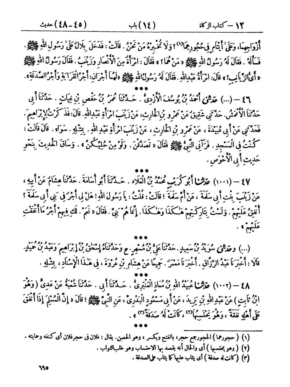 ٤٦ - (١٠٠٠) حَدَّثَنِي أَحْمَدُ بْنُ يُوسُفَ الْأَزْدِيُّ، حَدَّثَنَا عُمَرُ بْنُ حَفْصِ بْنِ غِيَاثٍ، حَدَّثَنَا أَبِي، حَدَّثَنَا الْأَعْمَشُ، حَدَّثَنِي شَقِيقٌ، عَنْ عَمْرِو بْنِ الْحَارِثِ، عَنْ زَيْنَبَ امْرَأَةِ عَبْدِ اللهِ قَالَ: فَذَكَرْتُ لِإِبْرَاهِيمَ، فَحَدَّثَنِي عَنْ أَبِي عُبَيْدَةَ، عَنْ عَمْرِو بْنِ الْحَارِثِ، عَنْ زَيْنَبَ امْرَأَةِ عَبْدِ اللهِ بِمِثْلِهِ سَوَاءً، قَالَ قَالَتْ: كُنْتُ فِي الْمَسْجِدِ، فَرَآنِي النَّبِيُّ صَلَّى اللهُ عَلَيْهِ وَسَلَّمَ فَقَالَ: «تَصَدَّقْنَ، وَلَوْ مِنْ حُلِيِّكُنَّ» وَسَاقَ الْحَدِيثَ بِنَحْوِ حَدِيثِ أَبِي الْأَحْوَصِ