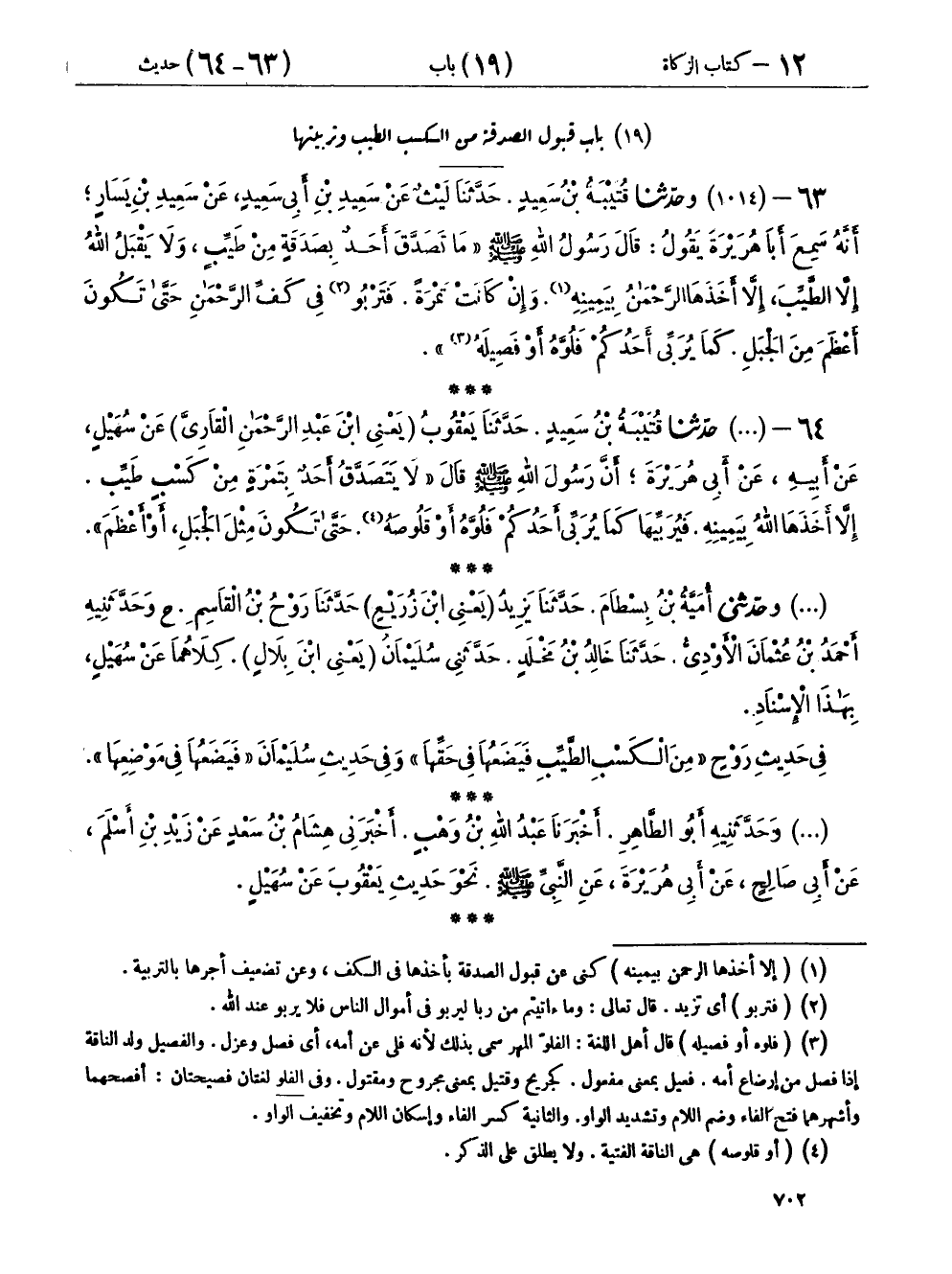 (١٠١٤) وحَدَّثَنِي أُمَيَّةُ بْنُ بِسْطَامَ، حَدَّثَنَا يَزِيدُ يَعْنِي ابْنَ زُرَيْعٍ، حَدَّثَنَا رَوْحُ بْنُ الْقَاسِمِ، ح وحَدَّثَنِيهِ أَحْمَدُ بْنُ عُثْمَانَ الْأَوْدِيُّ، حَدَّثَنَا خَالِدُ بْنُ مَخْلَدٍ، حَدَّثَنِي سُلَيْمَانُ يَعْنِي ابْنَ بِلَالٍ، كِلَاهُمَا عَنْ سُهَيْلٍ، بِهَذَا الْإِسْنَادِ، فِي حَدِيثِ رَوْحٍ «مِنَ الْكَسْبِ الطَّيِّبِ فَيَضَعُهَا فِي حَقِّهَا» وَفِي حَدِيثِ سُلَيْمَانَ «فَيَضَعُهَا فِي مَوْضِعِهَا» وحَدَّثَنِيهِ أَبُو الطَّاهِرِ، أَخْبَرَنَا عَبْدُ اللهِ بْنُ وَهْبٍ، أَخْبَرَنِي هِشَامُ بْنُ سَعْدٍ، عَنْ زَيْدِ بْنِ أَسْلَمَ، عَنْ أَبِي صَالِحٍ، عَنْ أَبِي هُرَيْرَةَ، عَنِ النَّبِيِّ صَلَّى اللهُ عَلَيْهِ وَسَلَّمَ، نَحْوَ حَدِيثِ يَعْقُوبَ، عَنْ سُهَيْلٍ