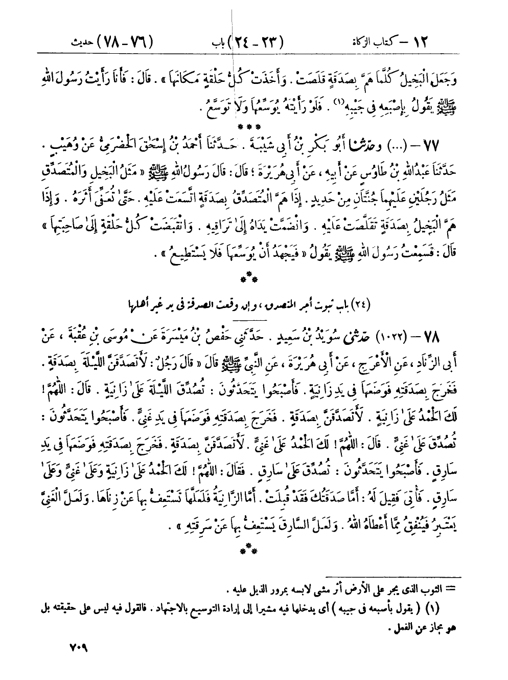 ٧٧ - (١٠٢١) وحَدَّثَنَا أَبُو بَكْرِ بْنُ أَبِي شَيْبَةَ، حَدَّثَنَا أَحْمَدُ بْنُ إِسْحَاقَ الْحَضْرَمِيُّ، عَنْ وُهَيْبٍ، حَدَّثَنَا عَبْدُ اللهِ بْنُ طَاوُسٍ، عَنْ أَبِيهِ، عَنْ أَبِي هُرَيْرَةَ، قَالَ: قَالَ رَسُولُ اللهِ صَلَّى اللهُ عَلَيْهِ وَسَلَّمَ: «مَثَلُ الْبَخِيلِ وَالْمُتَصَدِّقِ مَثَلُ رَجُلَيْنِ عَلَيْهِمَا جُنَّتَانِ مِنْ حَدِيدٍ، إِذَا هَمَّ الْمُتَصَدِّقُ بِصَدَقَةٍ اتَّسَعَتْ عَلَيْهِ، حَتَّى تُعَفِّيَ أَثَرَهُ، وَإِذَا هَمَّ الْبَخِيلُ بِصَدَقَةٍ تَقَلَّصَتْ عَلَيْهِ، وَانْضَمَّتْ يَدَاهُ إِلَى تَرَاقِيهِ، وَانْقَبَضَتْ كُلُّ حَلْقَةٍ إِلَى صَاحِبَتِهَا» قَالَ: فَسَمِعْتُ رَسُولَ اللهِ صَلَّى اللهُ عَلَيْهِ وَسَلَّمَ، يَقُولُ: «فَيَجْهَدُ أَنْ يُوَسِّعَهَا فَلَا يَسْتَطِيعُ»