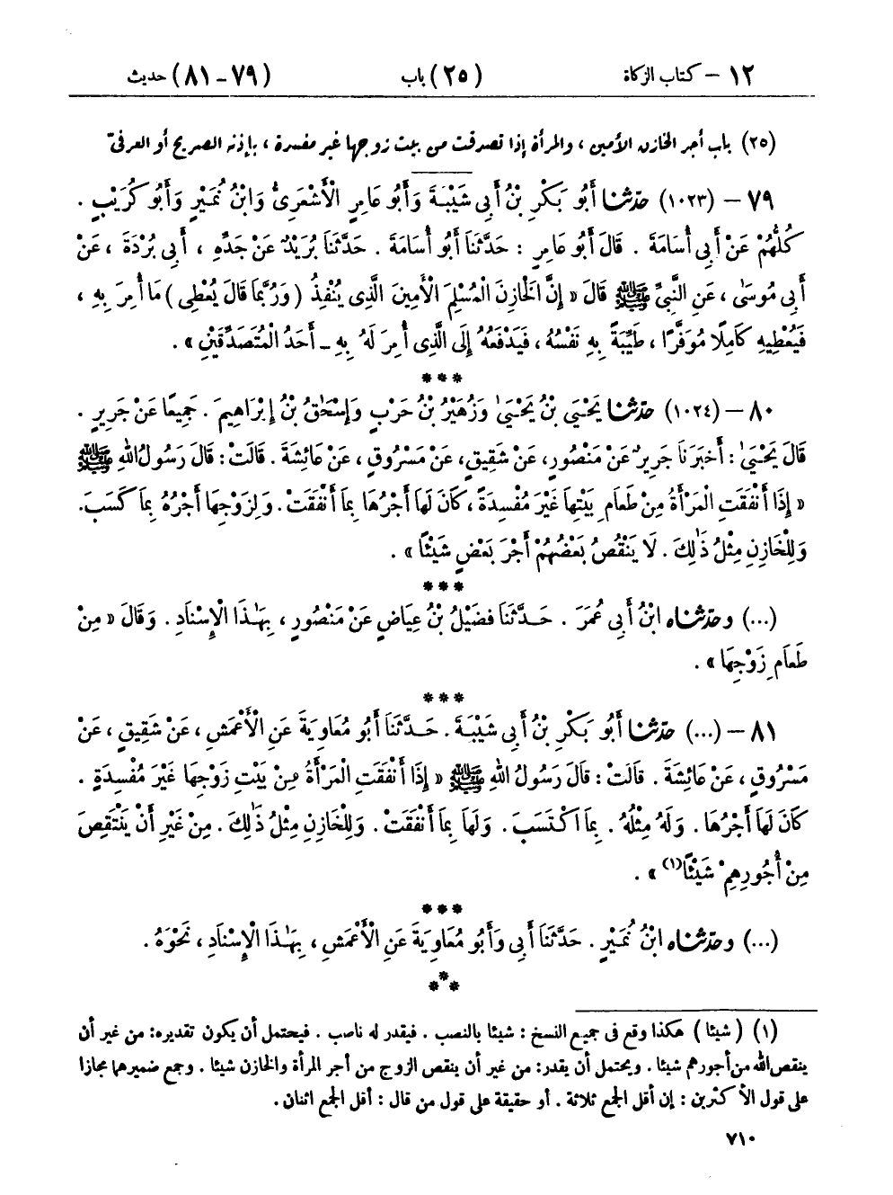٨١ - (١٠٢٤) حَدَّثَنَا أَبُو بَكْرِ بْنُ أَبِي شَيْبَةَ، حَدَّثَنَا أَبُو مُعَاوِيَةَ، عَنِ الْأَعْمَشِ، عَنْ شَقِيقٍ، عَنْ مَسْرُوقٍ، عَنْ عَائِشَةَ، قَالَتْ: قَالَ رَسُولُ اللهِ صَلَّى اللهُ عَلَيْهِ وَسَلَّمَ: «إِذَا أَنْفَقَتِ الْمَرْأَةُ مِنْ بَيْتِ زَوْجِهَا غَيْرَ مُفْسِدَةٍ، كَانَ لَهَا أَجْرُهَا، وَلَهُ مِثْلُهُ، بِمَا اكْتَسَبَ، وَلَهَا بِمَا أَنْفَقَتْ، وَلِلْخَازِنِ مِثْلُ ذَلِكَ، مِنْ غَيْرِ أَنْ يَنْتَقِصَ مِنْ أُجُورِهِمْ شَيْئًا»