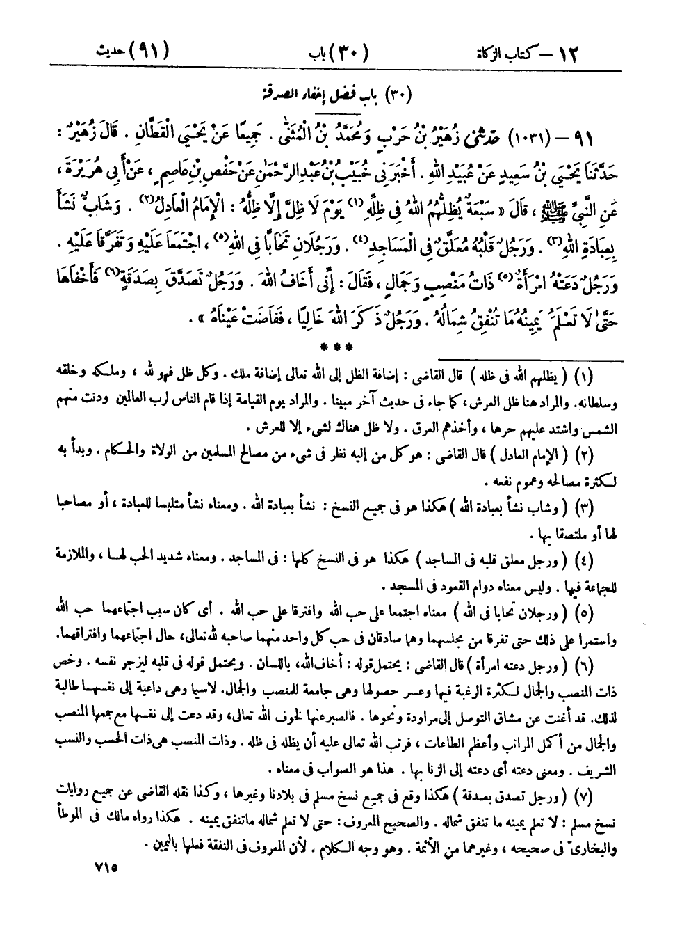 ٩١ - (١٠٣١) حَدَّثَنِي زُهَيْرُ بْنُ حَرْبٍ، وَمُحَمَّدُ بْنُ الْمُثَنَّى، جَمِيعًا عَنْ يَحْيَى الْقَطَّانِ، قَالَ زُهَيْرٌ: حَدَّثَنَا يَحْيَى بْنُ سَعِيدٍ، عَنْ عُبَيْدِ اللهِ، أَخْبَرَنِي خُبَيْبُ بْنُ عَبْدِ الرَّحْمَنِ، عَنْ حَفْصِ بْنِ عَاصِمٍ، عَنْ أَبِي هُرَيْرَةَ، عَنِ النَّبِيِّ صَلَّى اللهُ عَلَيْهِ وَسَلَّمَ، قَالَ: " سَبْعَةٌ يُظِلُّهُمُ اللهُ فِي ظِلِّهِ يَوْمَ لَا ظِلَّ إِلَّا ظِلُّهُ: الْإِمَامُ الْعَادِلُ، وَشَابٌّ نَشَأَ بِعِبَادَةِ اللهِ، وَرَجُلٌ قَلْبُهُ مُعَلَّقٌ فِي الْمَسَاجِدِ، وَرَجُلَانِ تَحَابَّا فِي اللهِ اجْتَمَعَا عَلَيْهِ وَتَفَرَّقَا عَلَيْهِ، وَرَجُلٌ دَعَتْهُ امْرَأَةٌ ذَاتُ مَنْصِبٍ وَجَمَالٍ، فَقَالَ: إِنِّي أَخَافُ اللهَ، وَرَجُلٌ تَصَدَّقَ بِصَدَقَةٍ فَأَخْفَاهَا حَتَّى لَا تَعْلَمَ يَمِينُهُ مَا تُنْفِقُ شِمَالُهُ، وَرَجُلٌ ذَكَرَ اللهَ خَالِيًا، فَفَاضَتْ عَيْنَاهُ "